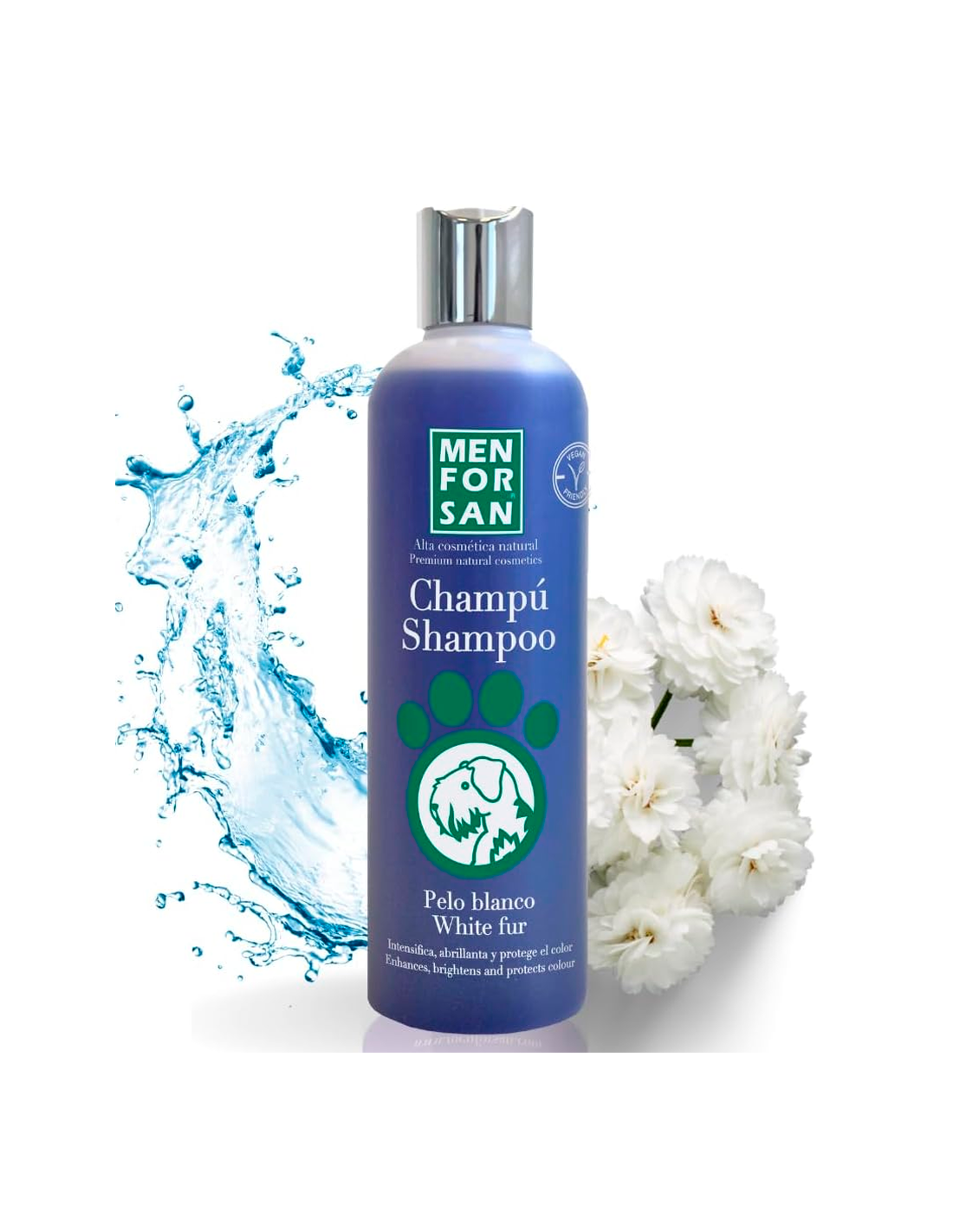 MenForSan Xampú Pèl Blanc és un xampú de màxima qualitat dissenyat per a gossos amb pelatges blancs i tons clars (com West Highland Terrier, Skye Terrier). La seva fórmula amb pH neutre treu les antiestètiques taques grises i grogues, intensificant i realçant la brillantor i el color original de forma natural. Revitalitza, hidrata i recupera l'aspecte sa del pelatge, sent apte per a ús freqüent.