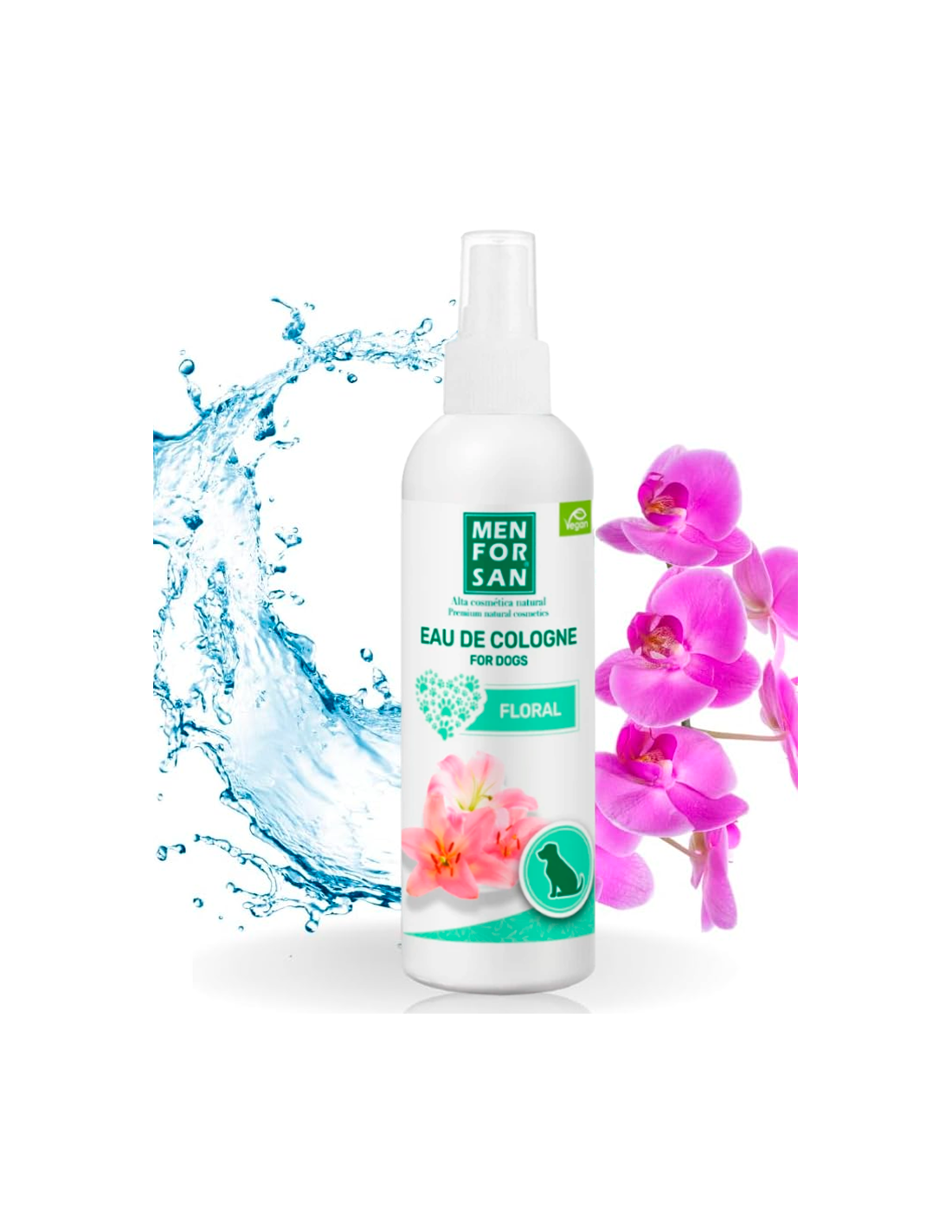 MenForSan Colònia Floral és una colònia per a gossos amb fragància FLORAL, ideal per després del bany. Proporciona una olor fresca i un intens efecte desodorant, respectant la pell i les propietats olfactives de l'animal. La seva fórmula sense alcohol i pH neutre evita irritacions.