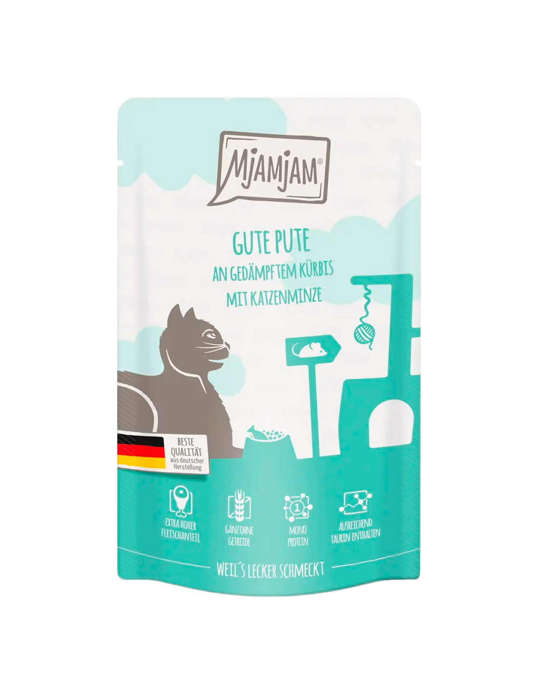 MjAMjAM Cat Gall dindi amb Carbassa al vapor és un aliment humit complet que ofereix a la teva mascota tot el que necessita. Gall dindi combinat amb carbassa al vapor i un toc d'herba gatera, proporciona una experiència culinària única i totes les vitamines i minerals essencials. Amb un contingut de carn molt alt i sense cereals, sucres ni conservants sintètics.