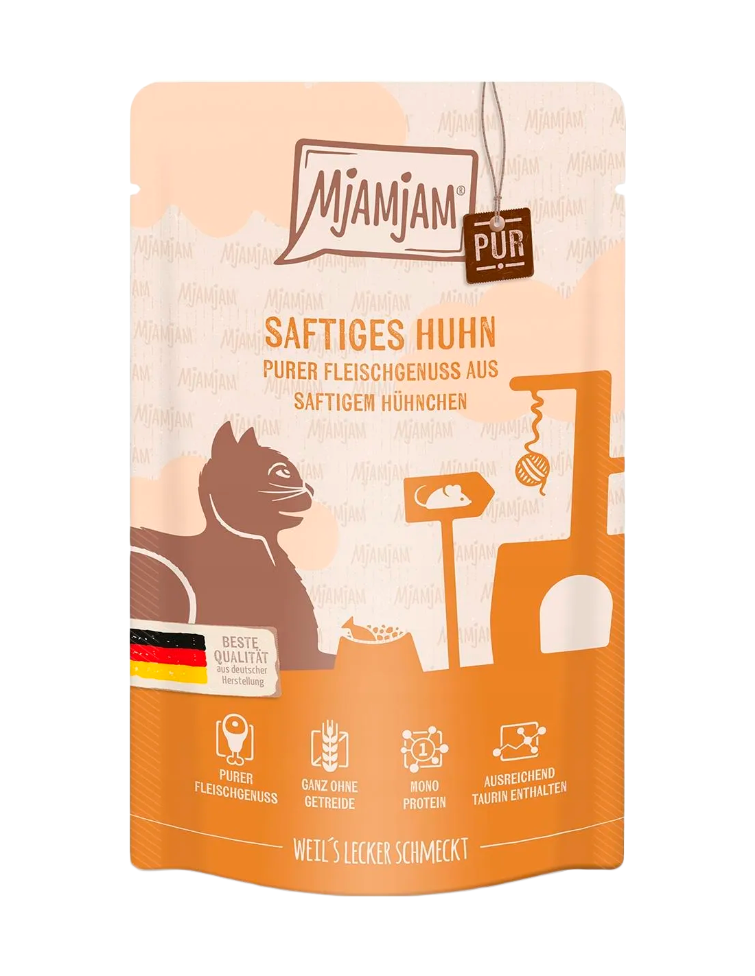 MjAMjAM Cat Pollastre Pur és un aliment humit complet sense cereals, elaborat amb 100% Pollastre Fresc. Ofereix una experiència culinària única alhora que proporciona al teu gat totes les vitamines i minerals essencials per a una alimentació natural i de qualitat superior.