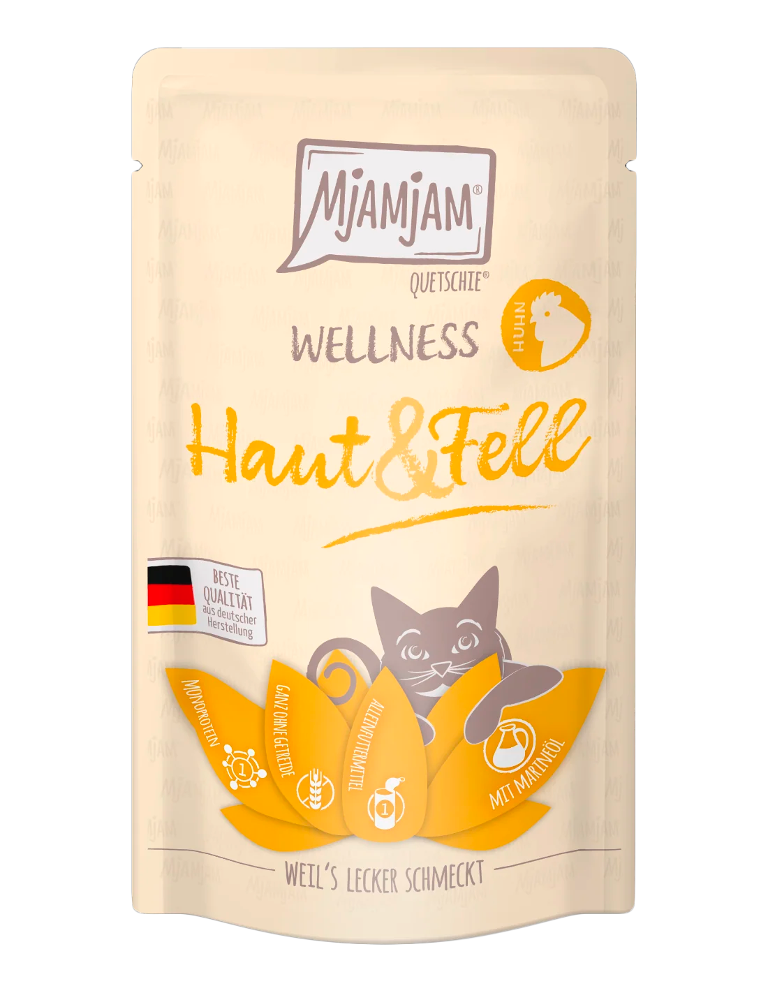 MJAMJAM Wellness Pell i Pèl Pollastre és un deliciós aliment complet monoproteic i sense cereals, amb un alt contingut de pollastre. Formulat amb una barreja especial d'olis marins i llevat de cervesa, revitalitza el teu gat des de dins, promovent un pelatge brillant i una pell sana.