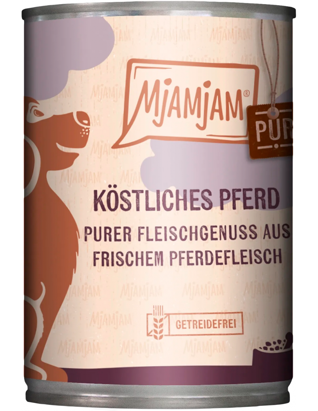 MjAMjAM Dog Cavall Pur és un aliment humit complet i natural de qualitat superior, ideal per a gossos amb intoleràncies o al·lèrgies alimentàries. Està elaborat exclusivament amb carn de cavall, oferint una font de proteïna rica en nutrients essencials com ferro, zinc i vitamines A i B.