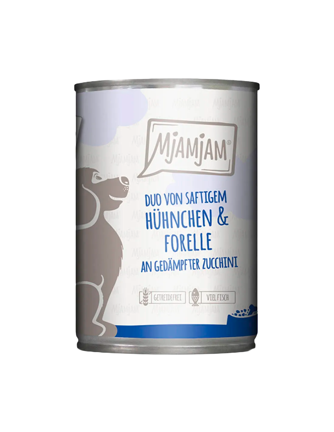 MjAMjAM Duo Pollastre i Truita amb Carbassó al Vapor és un aliment humit premium per a gossos adults, elaborat amb carns d'alta qualitat, carbassó natural i sense cereals. És ideal per a gossos amb digestió sensible o que busquen una dieta natural i equilibrada, oferint un aliment complet de qualitat superior.