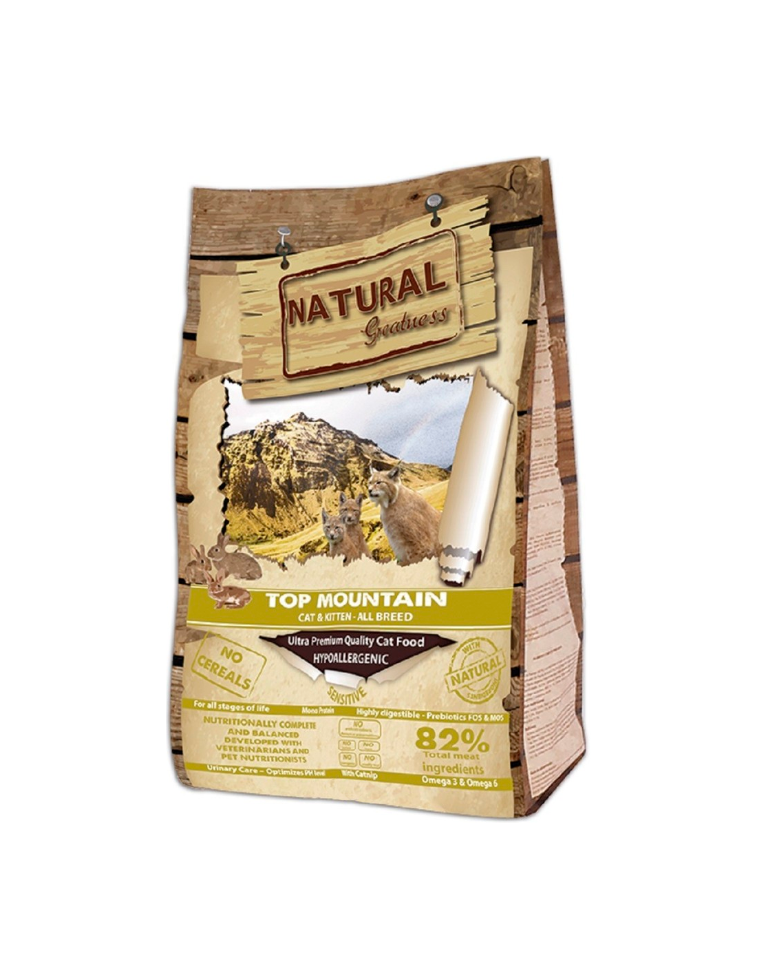 Natural Greatness TOP MOUNTAIN és un pinso ultra premium, hipoal·lergènic i monoproteic de conill (70% carn) sense cereals. Ideal per a gatets, gates gestants i gats adults amb sensibilitat a altres carns. Aquesta recepta afavoreix el tracte digestiu, el sistema immunològic i optimitza el pH urinari gràcies a la seva alta qualitat i nivells òptims de nutrients.