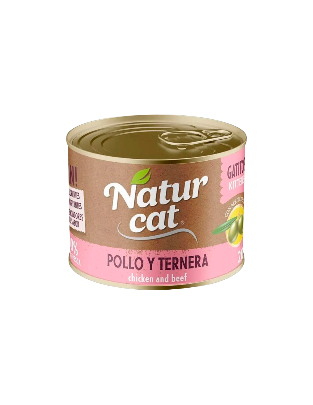 NaturCat Kitten Pollastre i Vedella és un aliment humit complet i de qualitat superior, dissenyat per a gatets fins als 12 mesos. Elaborat amb ingredients naturals (39% pollastre, 30% vedella) i cuinat amb oli d'oliva, és fàcilment digerible i aporta tots els aminoàcids essencials, minerals i vitamines necessaris per a un desenvolupament òptim.