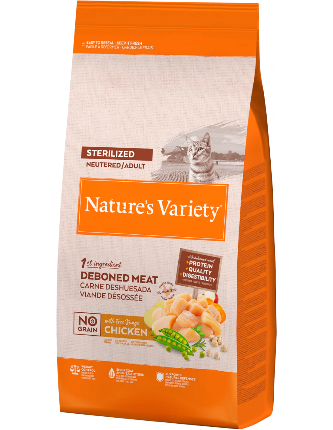 Nature's Variety Cat Adult Sterilized No Grain Pollo és un aliment complet i equilibrat, sense cereals, dissenyat per a gats adults esterilitzats. Elaborat amb carn de pollastre de corral desossat com a principal ingredient, i complementat amb fruites, verdures, superaliments i fonts naturals de carbohidrats alternatius.