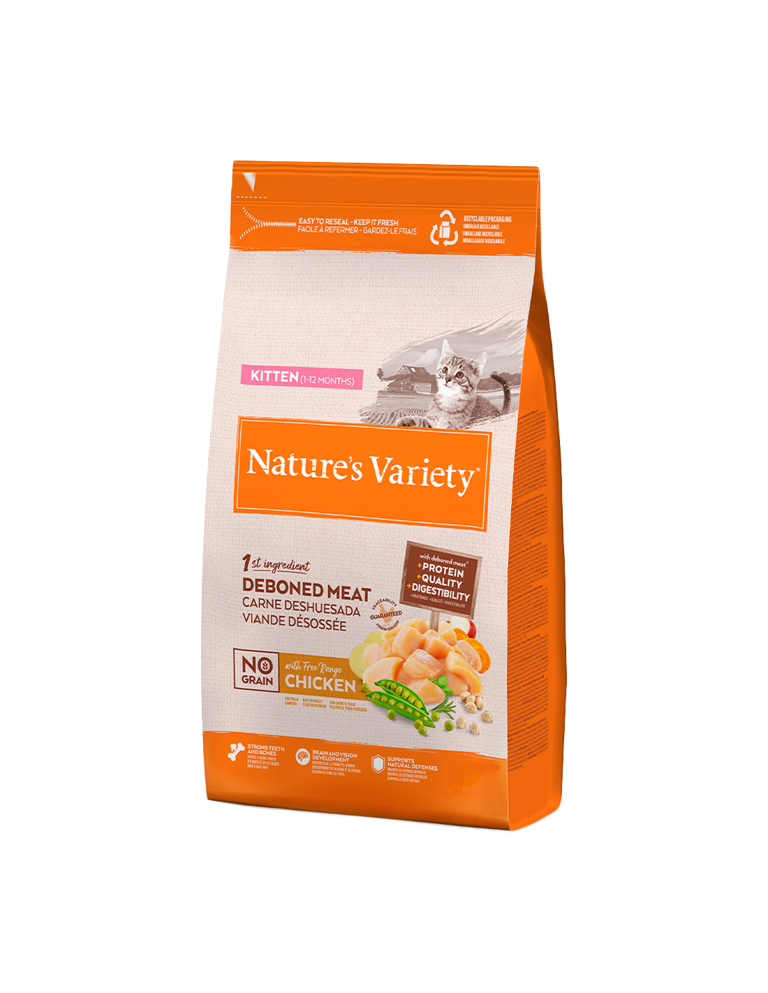 Nature's Variety Cat Kitten No Grain Pollastre és un aliment complet i equilibrat sense cereals per a gatets. Elaborat amb carn de pollastre pollastre de corral desossat com a ingredient principal, i complementat amb fruites, verdures i superaliments, està dissenyat per al desenvolupament de dents i ossos forts, la visió, el cervell i les defenses naturals.