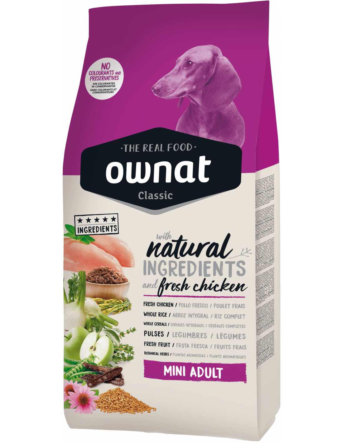 OWNAT CLASSIC MINI ADULT és un pinso especialment formulat per a gossos adults de races mini (entre 1 kg i 10 kg). Ofereix elevades aportacions calòriques i és molt ric en proteïnes per cobrir els alts requeriments d'aquestes races. Les seves croquetes de forma i mida reduïts, juntament amb la seva gran apetitositat, el fan ideal fins i tot per als paladars més capritxosos. És una opció completa i equilibrada, lliure de conservants i colorants artificials.