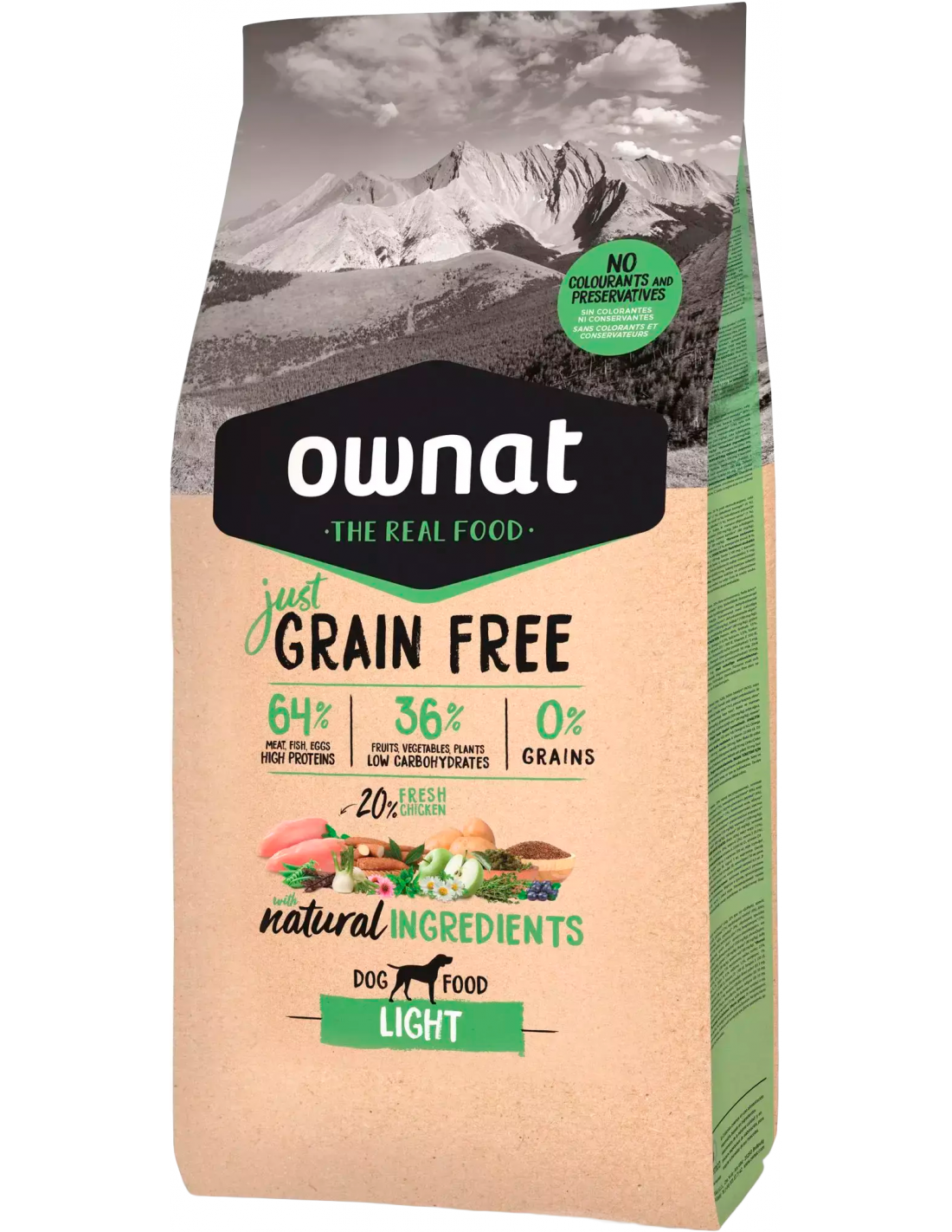 OWNAT GF JUST LIGHT és un pinso sense cereals especialment indicat per a gossos amb un nivell d'activitat baix o amb tendència al sobrepès. La seva fórmula amb una aportació reduïda de matèries grasses ajuda a recuperar i mantenir el pes ideal, mentre que la seva elevada proporció de proteïnes de màxima qualitat assegura el bon manteniment i tonicitat dels músculs.