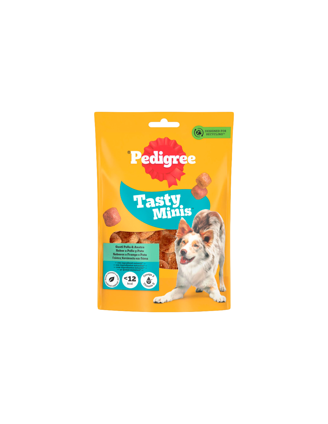 Pedigree Tasty Minis Pollastre i Ànec són snacks tous per a gossos, elaborats amb pollastre (4%) i ànec (1%), enriquits amb àcids grassos omega-3, vitamines i minerals. Sense colorants ni aromes artificials, són ideals com a premi durant l'ensinistrament o per reforçar el vincle amb el teu gos.