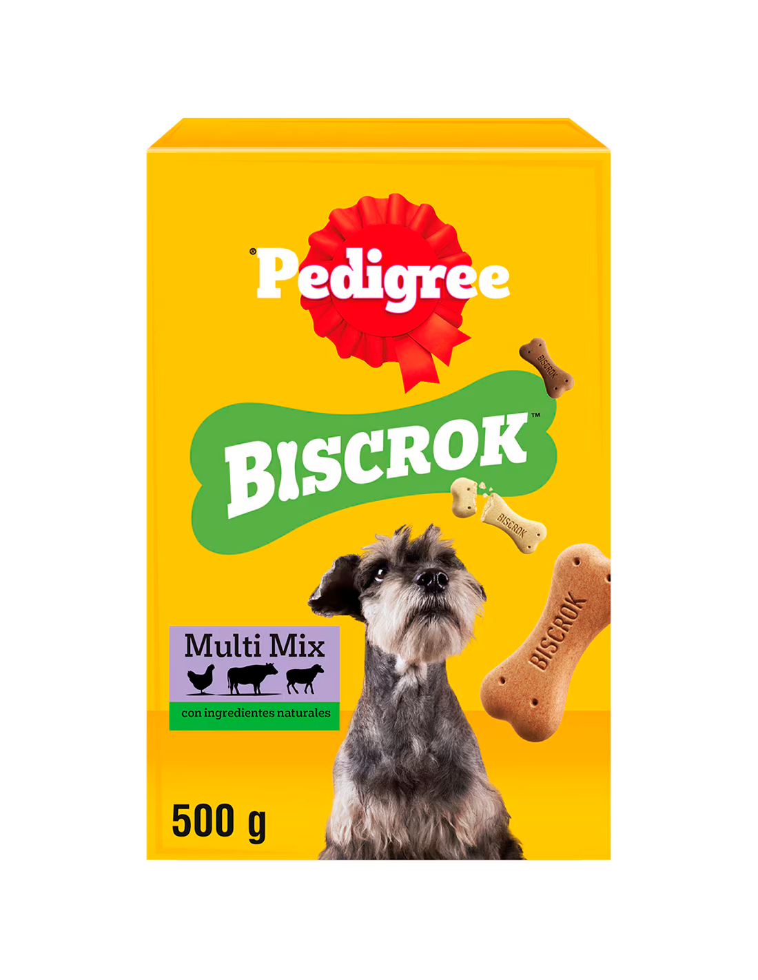 Pedigree Biscrok Multi Mix són galetes cruixents al forn per a gossos adults, disponibles en tres varietats en un mateix pack: galeta blanca amb pollastre (1%), galeta marró amb bou (1%) i galeta vermella amb xai (1%). Enriquides amb omega-3, vitamines i minerals, i sense colorants ni aromes artificials.