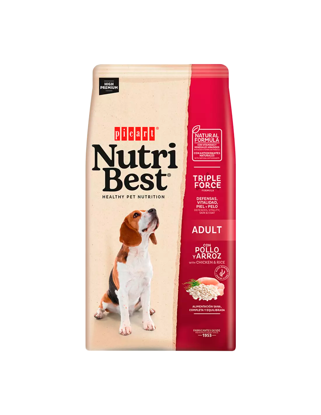 Picart Nutribest Dog Adult Pollastre i Arròs és un aliment High Premium complet amb pollastre i arròs, formulat per experts per a gossos adults (>12 mesos). Ajuda a que el teu gos creixi sa i vital, amb una salut òptima, i conté Algues Marines de l'Atlàntic Nord per a una pell i pèl saludables.