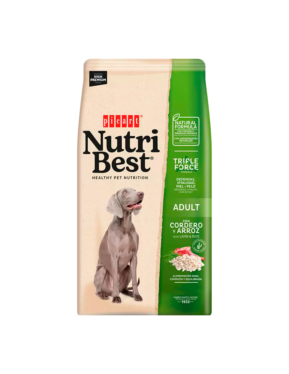 Picart Nutribest Dog Adult Xai i Arròs és un aliment High Premium complet amb xai i arròs per a gossos adults (>12 mesos). Formulat per experts, promou una salut òptima i vitalitat, sent una excel·lent alternativa per a gossos amb sensibilitats alimentàries a la carn de pollastre. Conté Algues Marines de l'Atlàntic Nord per a una pell i un pèl sans.