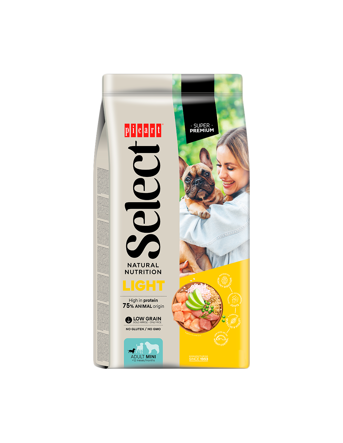 Picart Select Dog Adult Mini Light Pollastre, Gall Dindi i Arròs és un aliment complet baix en calories, dissenyat per a gossos adults de races petites amb tendència al sobrepès. La seva fórmula amb menor aportació calòrica i major contingut en fibra ajuda a mantenir el pes ideal i afavoreix la sensació de sacietat.