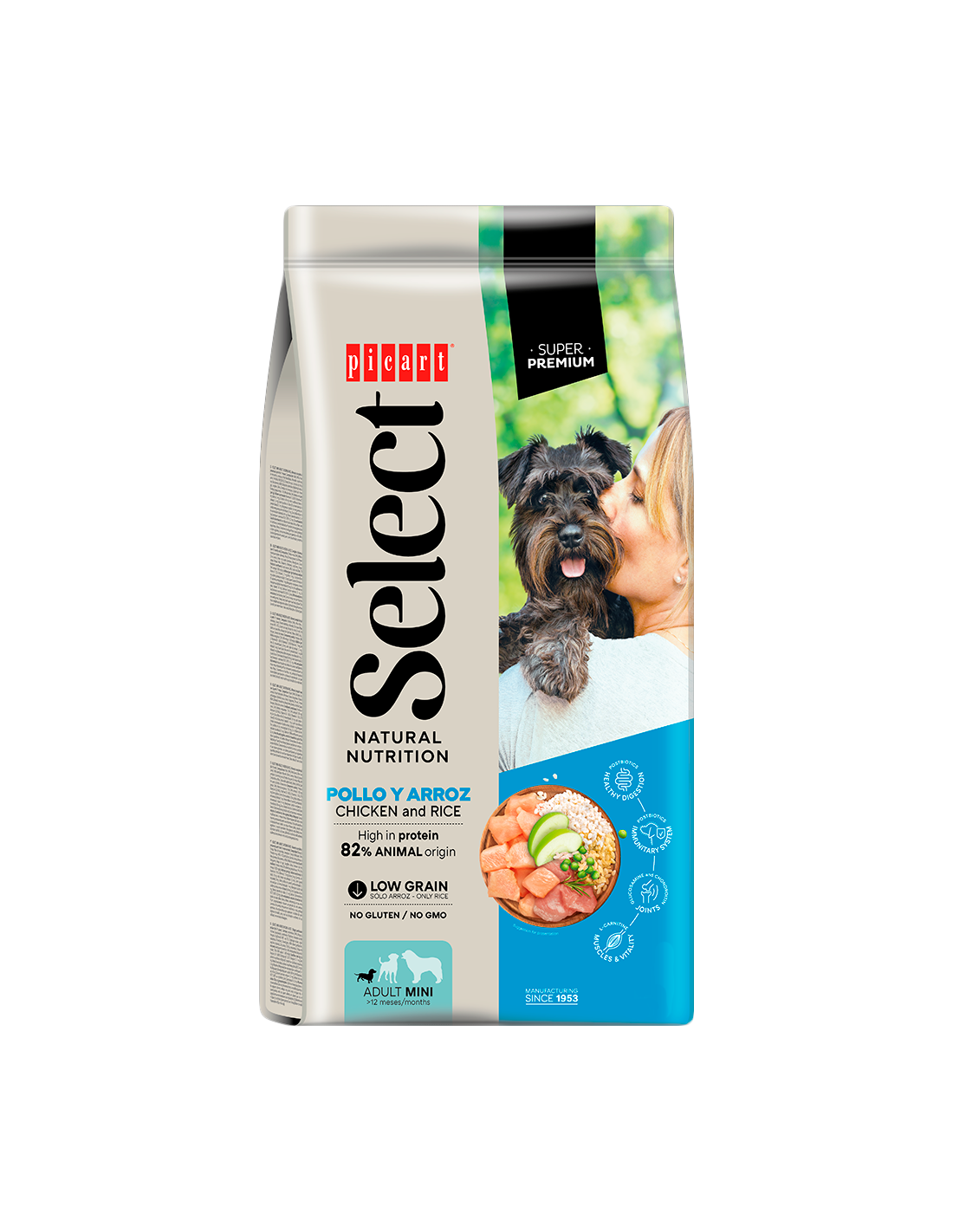 Picart Select Dog Adult Mini Pollastre és un aliment complet formulat específicament per a gossos adults de races petites. Dissenyat per cobrir el seu alt consum energètic i petit estómac, aporta nutrients essencials per mantenir la salut dental, cardíaca, articular, la brillantor del pèl i la vitalitat general.