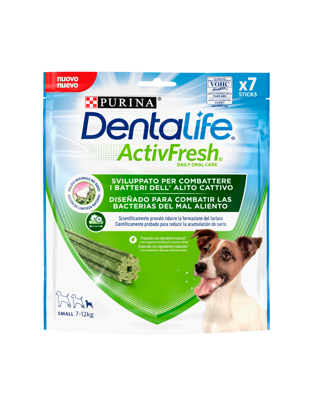 Els sticks Purina® Dentalife Dog ActivFresh Small Sticks estan dissenyats per combatre el mal alè i donar suport a la salut dental de gossos. Científicament provats, neutralitzen els bacteris responsables del mal alè gràcies a l'espirulina i la mel, alhora que redueixen la placa i el carrall amb la seva textura suau i esponjosa.