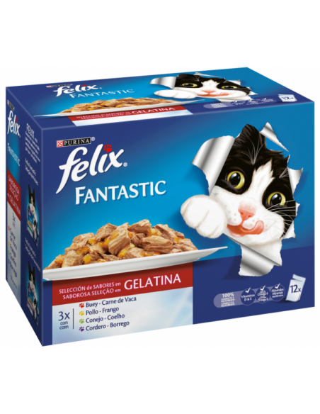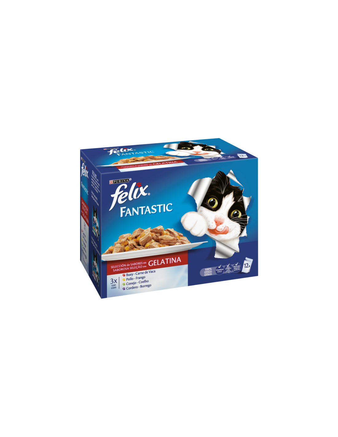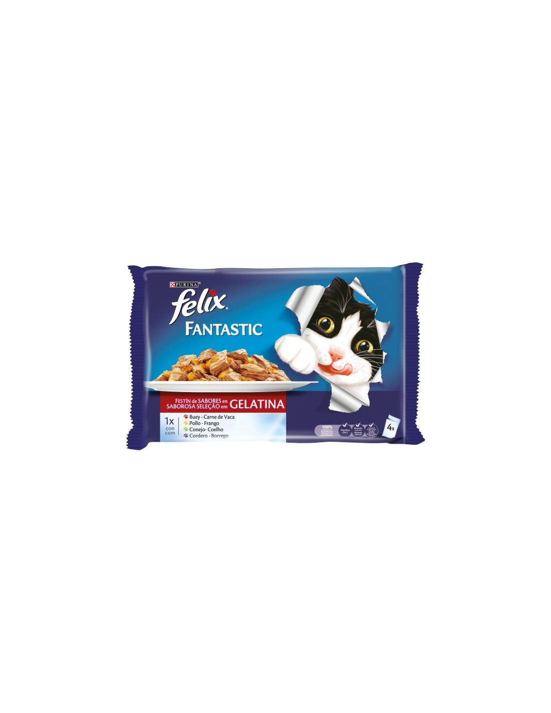 FELIX Fantastic DUO és una gamma de deliciosos menjars que tenen un aspecte, olor i sabor tan irresistible, que podrien semblar menjar cuinat per tu mateix. Cada recepta conté tendres trossos que combinen dues delicioses varietats de carns i peixos en una suculenta gelatina perquè el teu gat gaudeixi de dos dels seus sabors preferits al mateix menjar.
