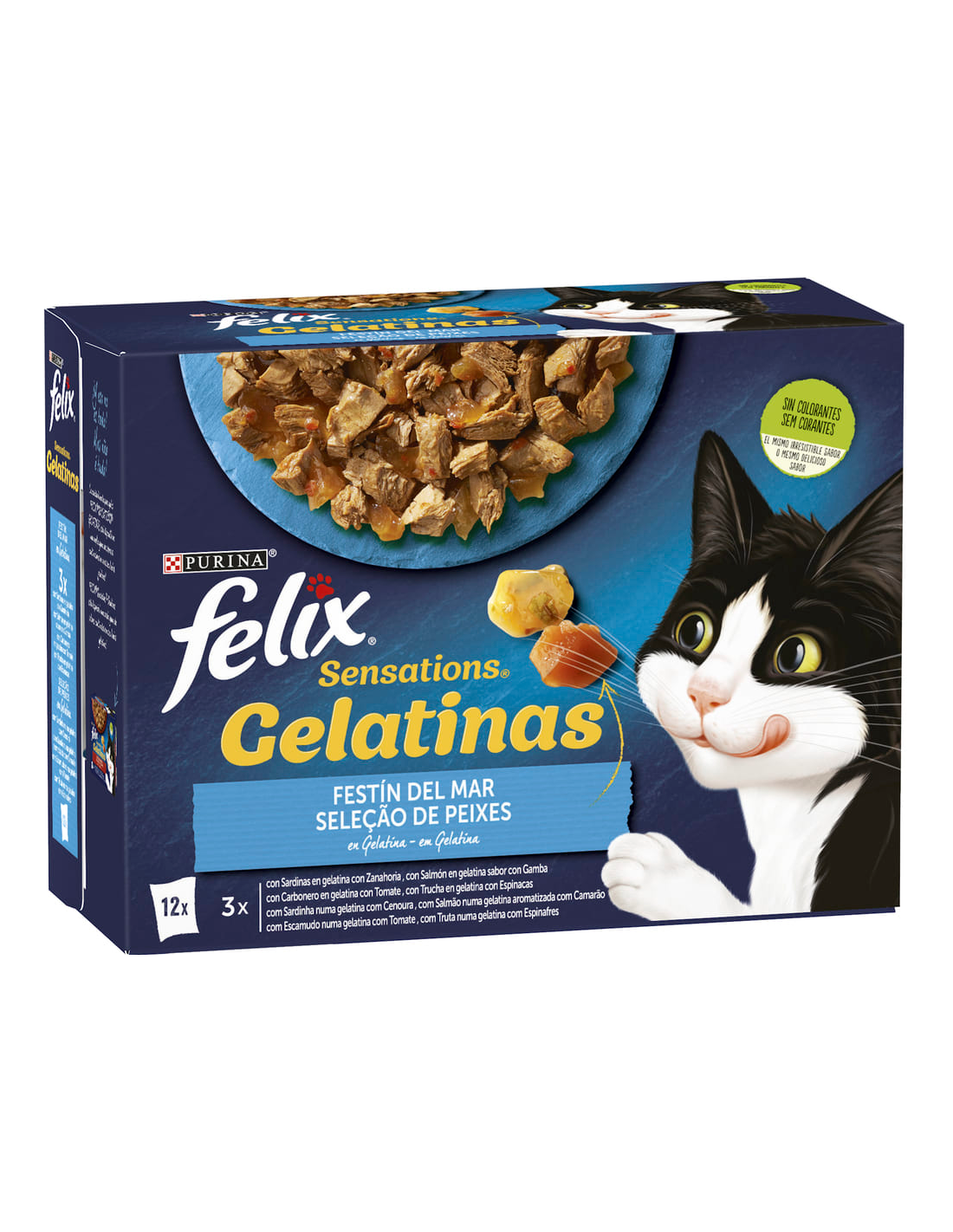 Purina Felix Sensations Festí del Mar en Gelatina ofereix una alimentació 100% completa i equilibrada per al teu gat. Elaborada amb ingredients de qualitat, aquest aliment humit destaca per la seva aparença, olor i deliciós sabor, enriquida amb Vitamines A&E i una font d'Àcids grassos Omega 6. No conté aromatitzants ni conservants artificials afegits.