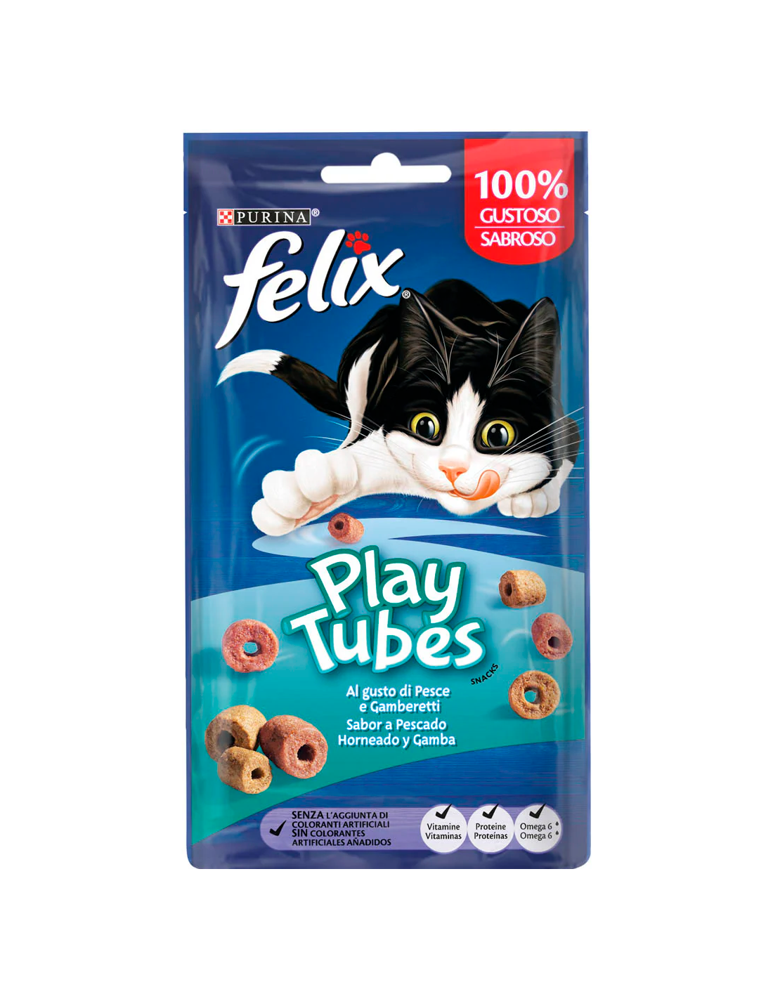 Els Purina Felix Play Tubes Peix i Gambes al Forn són snacks irresistibles i divertits per al teu gat. Amb una forma única de cilindre i tot el sabor que adora, aquests sucosos snacks estan elaborats amb ingredients de qualitat, incloent proteïnes, vitamines i àcids grassos Omega 6, per compartir un moment de joc i contribuir a la seva salut i felicitat.