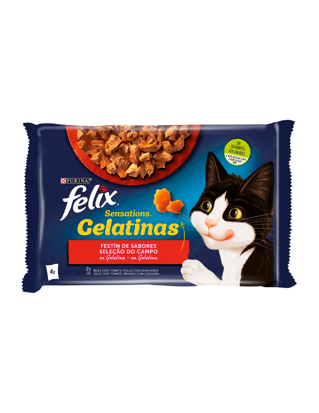 Purina Felix Sensations Festí de Sabors en Gelatina és una gamma d'aliment humit 100% complet i equilibrat per a gats. Elaborada amb ingredients de qualitat i sense aromatitzants ni conservants artificials, ofereix deliciosos trossets de carn o peix en saboroses gelatines, enriquida amb vitamines A&E i àcids grassos Omega 6.