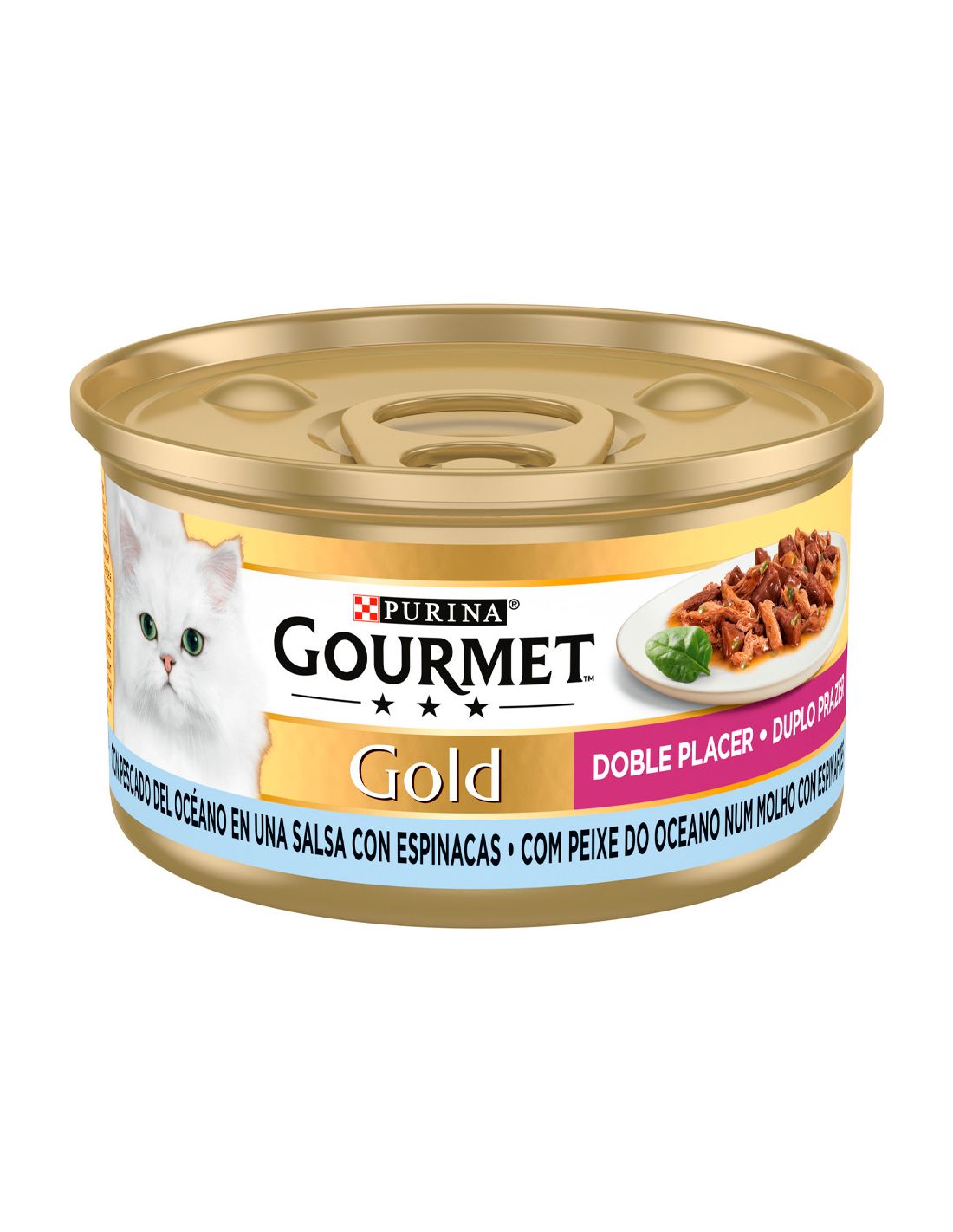 Purina Gourmet Gold Adult Doble Plaer amb Peix és un aliment humit 100% complet i equilibrat per a gats adults. Ofereix una experiència culinària única amb la combinació ideal de tendres trossets i fines làmines, cuinades acuradament per delectar el paladar del teu gat amb dues textures diferents en el mateix menjar.