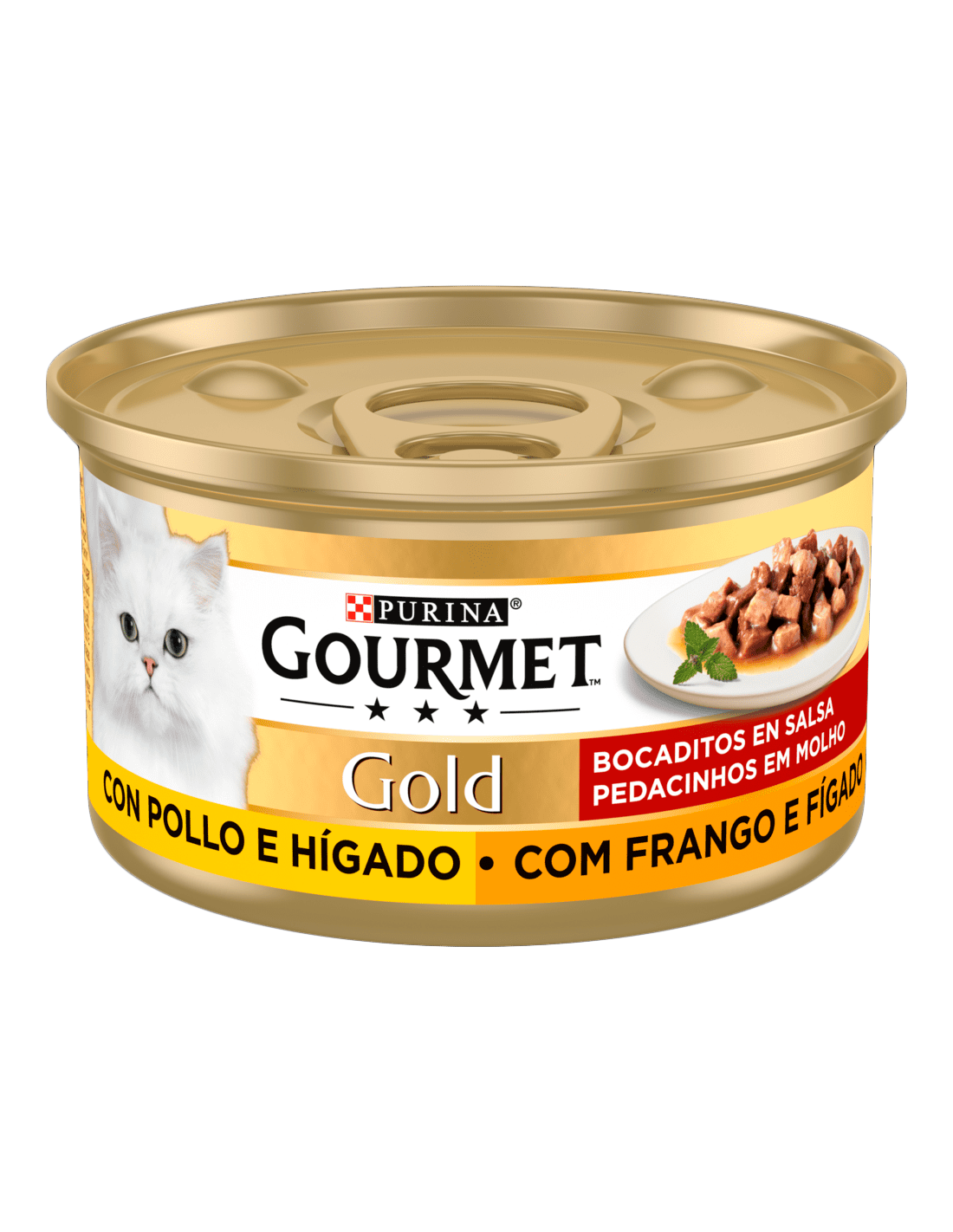 Purina Gourmet Gold Adult Mossets en Salsa Pollastre i Fetge és un aliment humit 100% complet i equilibrat per a gats adults. Ofereix una experiència culinària única amb tendres trossets de pollastre i fetge cuinats acuradament en una deliciosa salsa, pensats per satisfer el sofisticat paladar del teu gat amb un fabulós i ric sabor.