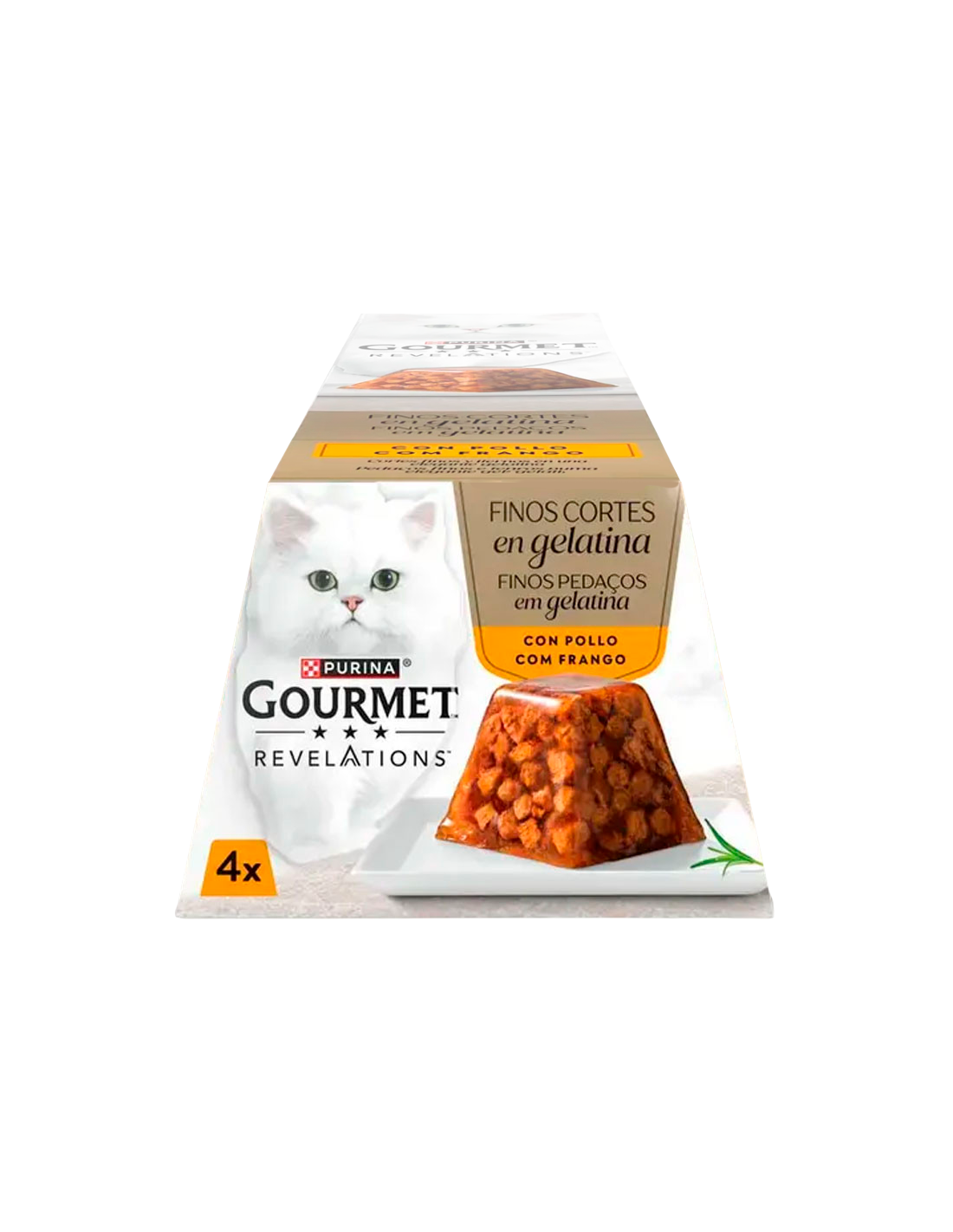 Purina Gourmet Revelations Adult Fins Talls Pollastre en Gelatina és un aliment complet i de luxe per a gats adults. Elaborat amb ingredients d'alta qualitat, ofereix tendres talls de pollastre finament tallats en una transparent i elegant gelatina, amb una forma perfecta per a una experiència exquisida i sense colorants.