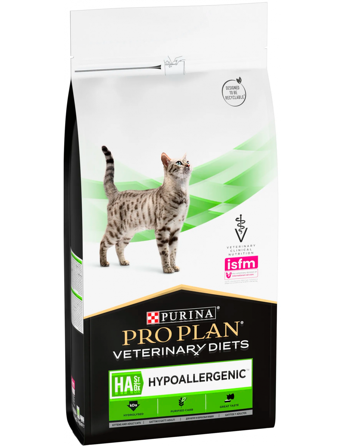 Purina Pro Plan Veterinary Diets Cat HA Hypoallergenic és un aliment dietètic complet per a gatets i gats adults, formulat específicament per a la reducció de la intolerància a ingredients i nutrients. Conté fonts de proteïna hidrolitzada i carbohidrats purificats, ideal per al diagnòstic i tractament d'al·lèrgies alimentàries.