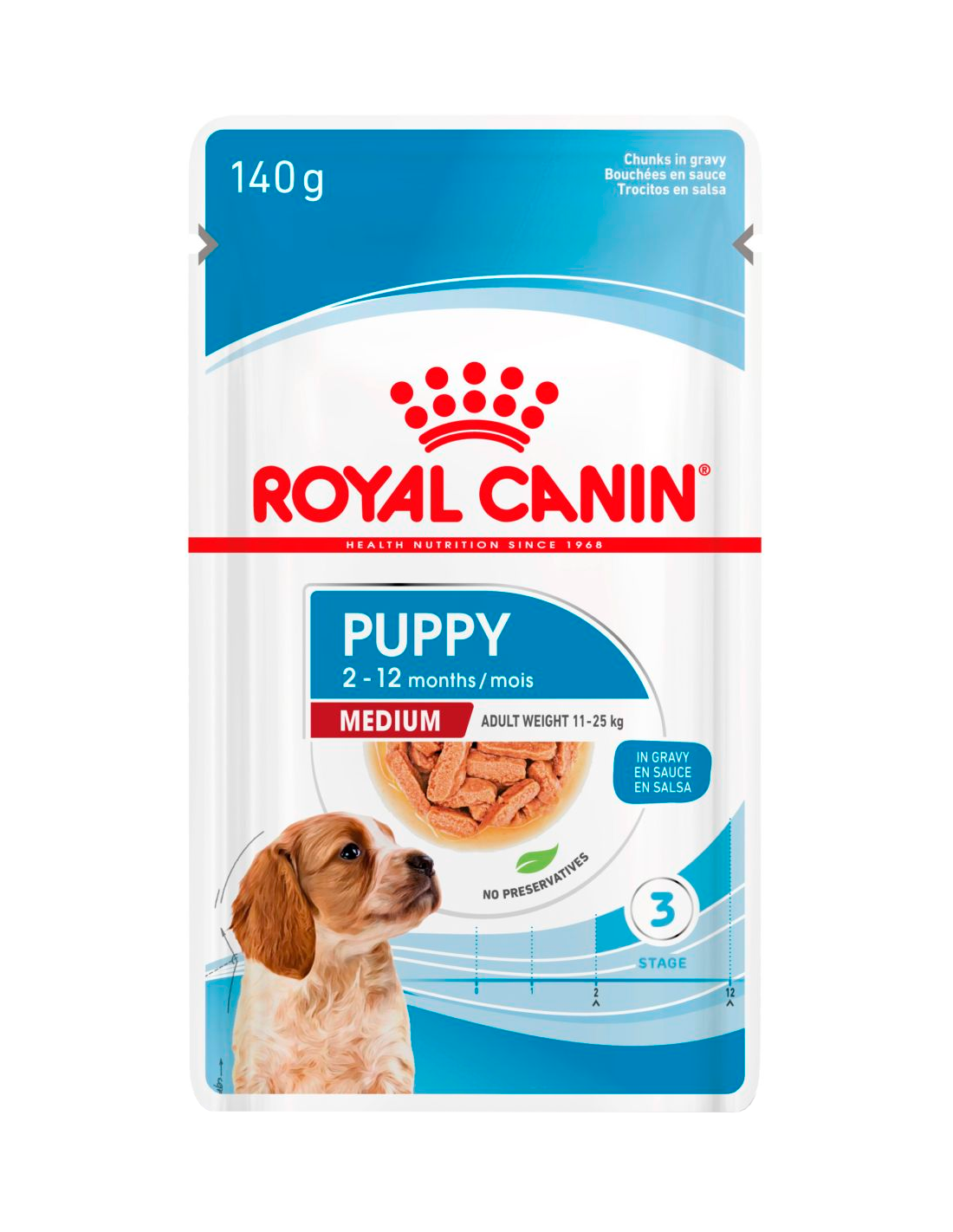 ROYAL CANIN® Medium Puppy Trossos en salsa és un aliment humit complet, especialment formulat per a cadells de races mitjanes (11-25 kg de pes adult, fins a 12 mesos). Els seus apetitosos trossos en salsa estan dissenyats per al creixement, afavorint les defenses naturals, el desenvolupament cerebral i la salut digestiva dels cadells.