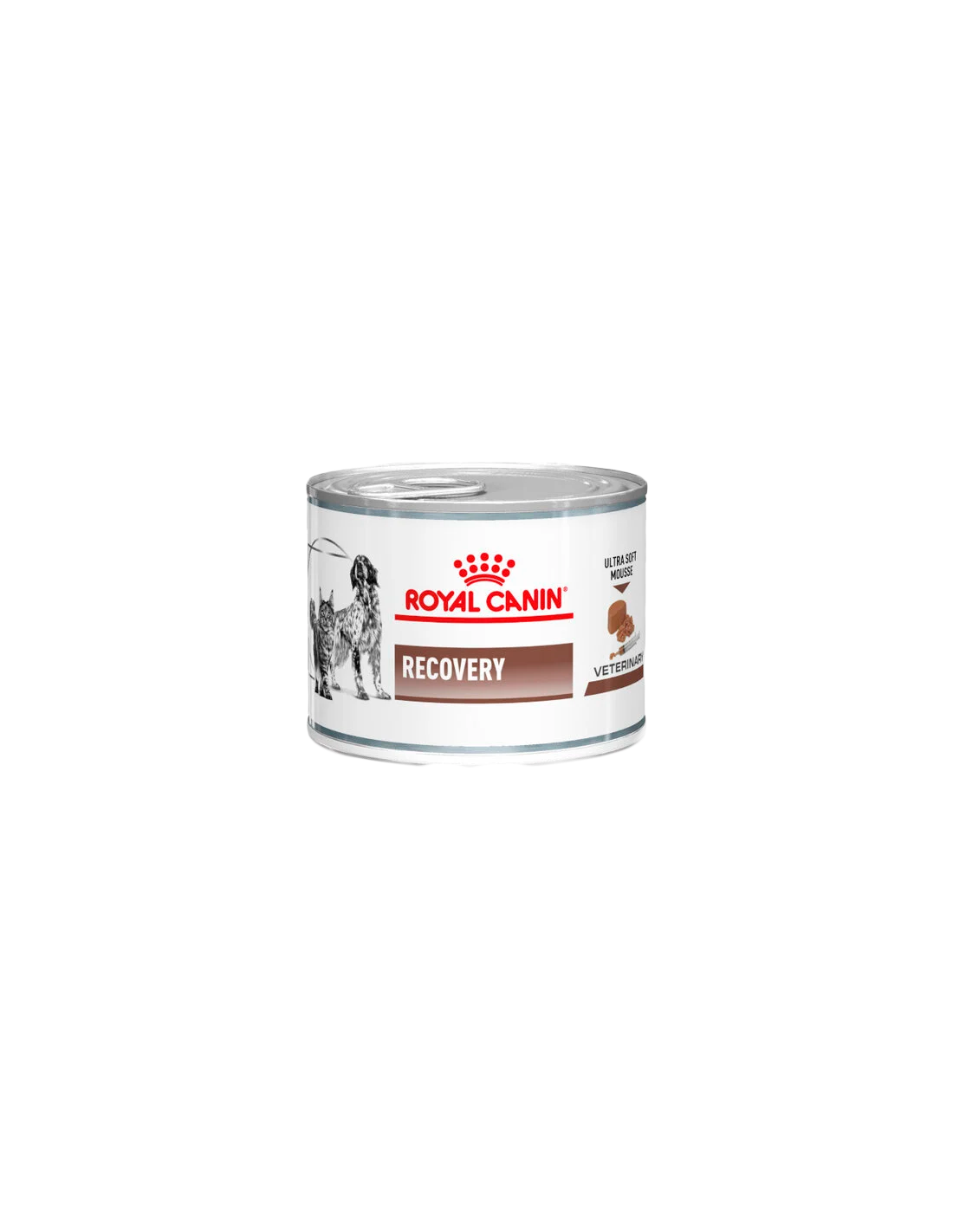 ROYAL CANIN® Recovery és un aliment humit dietètic complet, formulat especialment per ajudar la teva mascota (gossos i gats) durant períodes de convalescència i recuperació. La seva alta densitat energètica cobreix les necessitats amb un volum reduït, i el seu alt contingut de proteïna ajuda a mantenir la massa muscular.