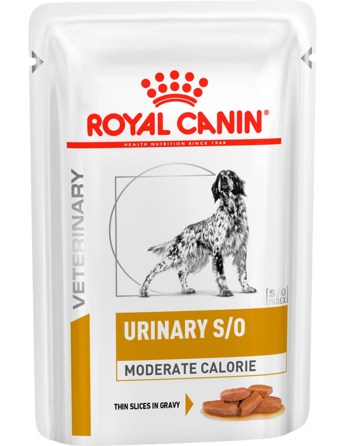 ROYAL CANIN® Urinary S/O Moderate Calorie carn en salsa és un aliment humit dietètic complet per a gossos adults, específicament formulat per ajudar amb sensibilitats urinàries (càlculs d'estruvita) en gossos amb tendència a menjar en excés. El seu contingut calòric moderat ajuda a mantenir un pes saludable.