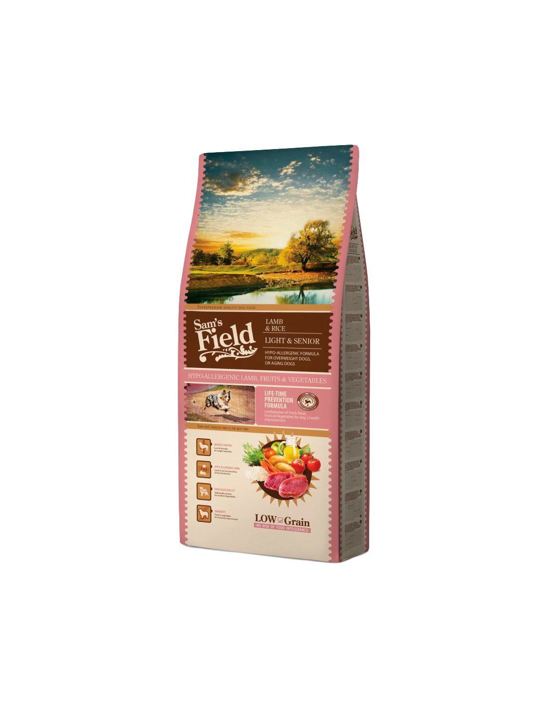 Sam's Field Light & Senior Xai i Arròs és una fórmula hipoal·lergènica amb xai, arròs, fruites i vegetals, dissenyada per a gossos amb sobrepès o ancians. La seva composició baixa en greixos afavoreix el control del pes, mentre que els seus ingredients asseguren una alta digestibilitat i un reforç immunitari.