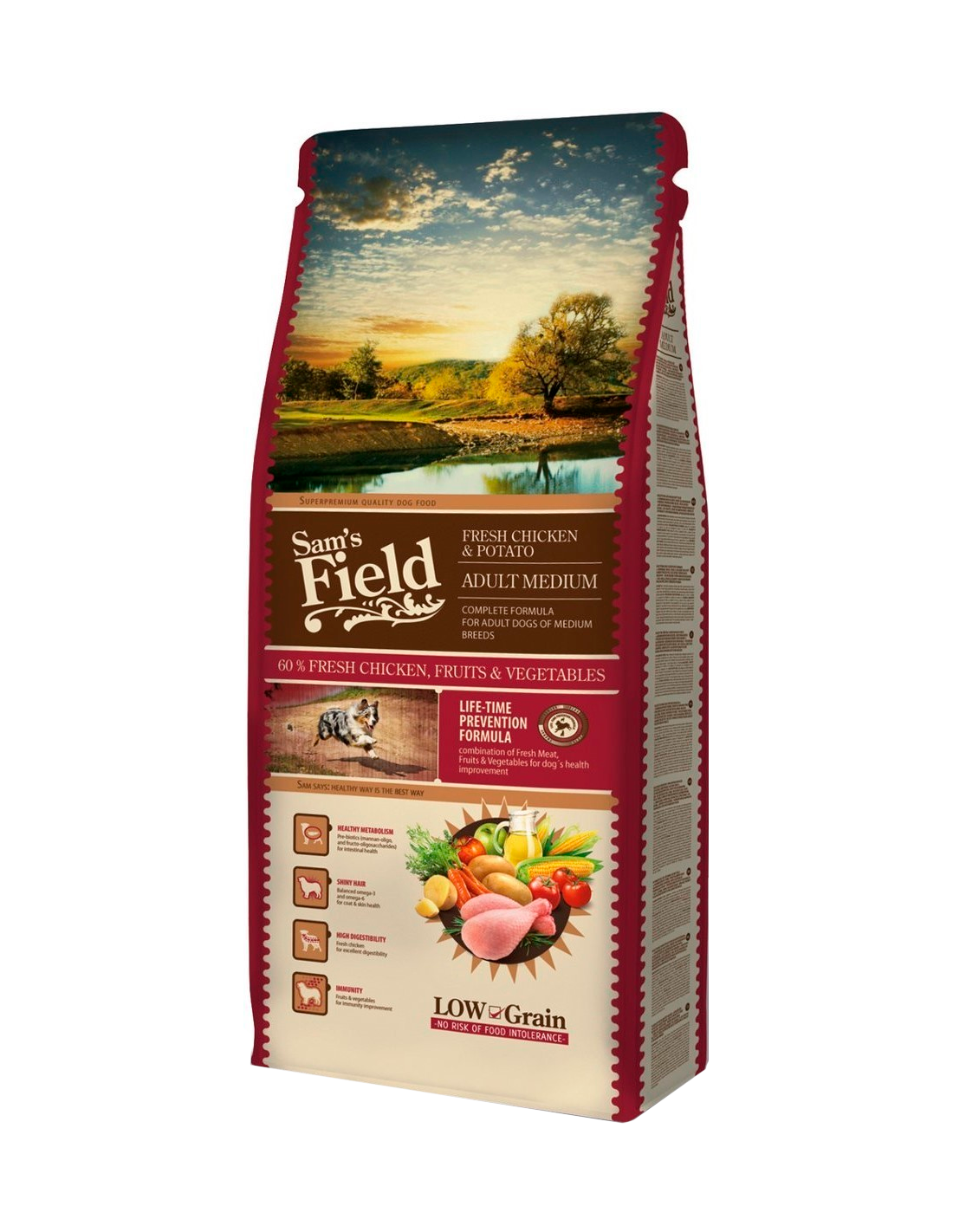 Sam's Field Adult Medium Pollastre i Patata és una fórmula completa dissenyada per a gossos adults de races de mida mitjana. Conté un 60% de pollastre, fruites i vegetals, oferint alta digestibilitat, un metabolisme saludable, un pelatge brillant i un sistema immunitari reforçat.
