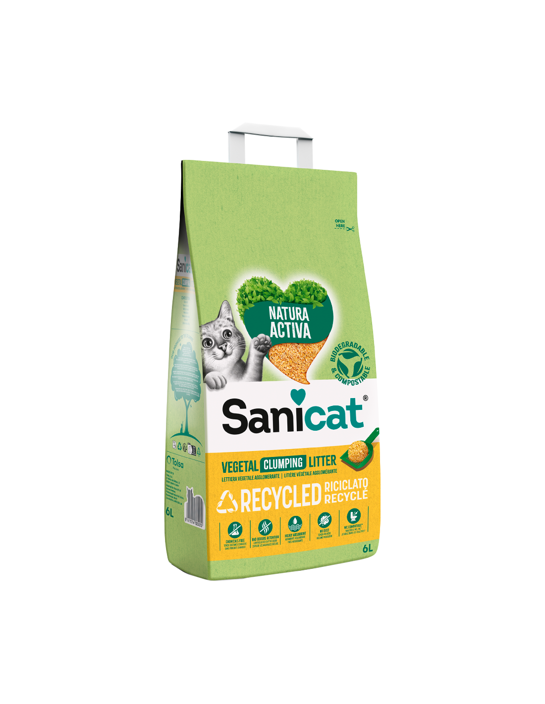 Sanicat Natura Activa Recycled és una sorra aglomerant d'origen vegetal, biodegradable i compostable, elaborada a partir de la recuperació de residus no alimentaris de la indústria del cultiu del blat de moro. Neutralitza les males olors de forma natural, forma grumolls fàcils de retirar i no genera pols. Sense colorants, perfums ni ingredients nocius afegits, conserva el seu origen natural al 100%.