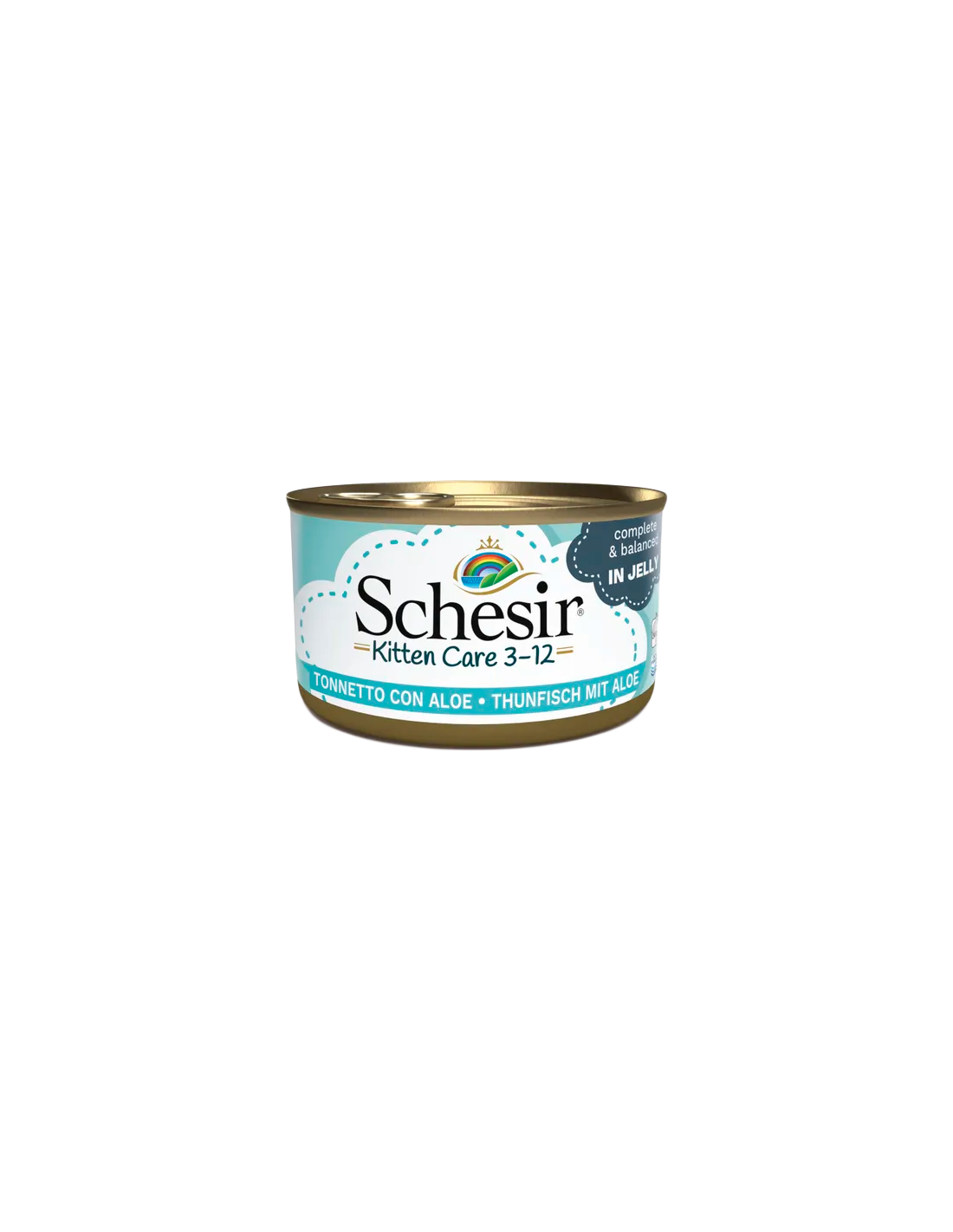Schesir Gatet Tonyina amb Àloe en gelatina és un aliment humit complet i equilibrat, específicament dissenyat per a cadells de 3 a 12 mesos. Elaborat amb ingredients 100% naturals, com autèntics filets de tonyina i àloe, cuinats al vapor i preparats a mà per a una màxima qualitat i sabor.