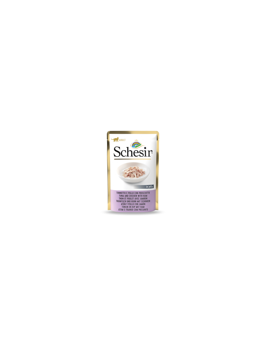 La recepta Schesir es prepara a base d'autèntics filets de tonyina i de pollastre, combinats amb un saborós topping de pernil per oferir una atractiva combinació de sabors. La preparació es realitza en gelatina per satisfer els gustos dels gats que prefereixen els sabors naturals, però amb una textura més densa al bol.