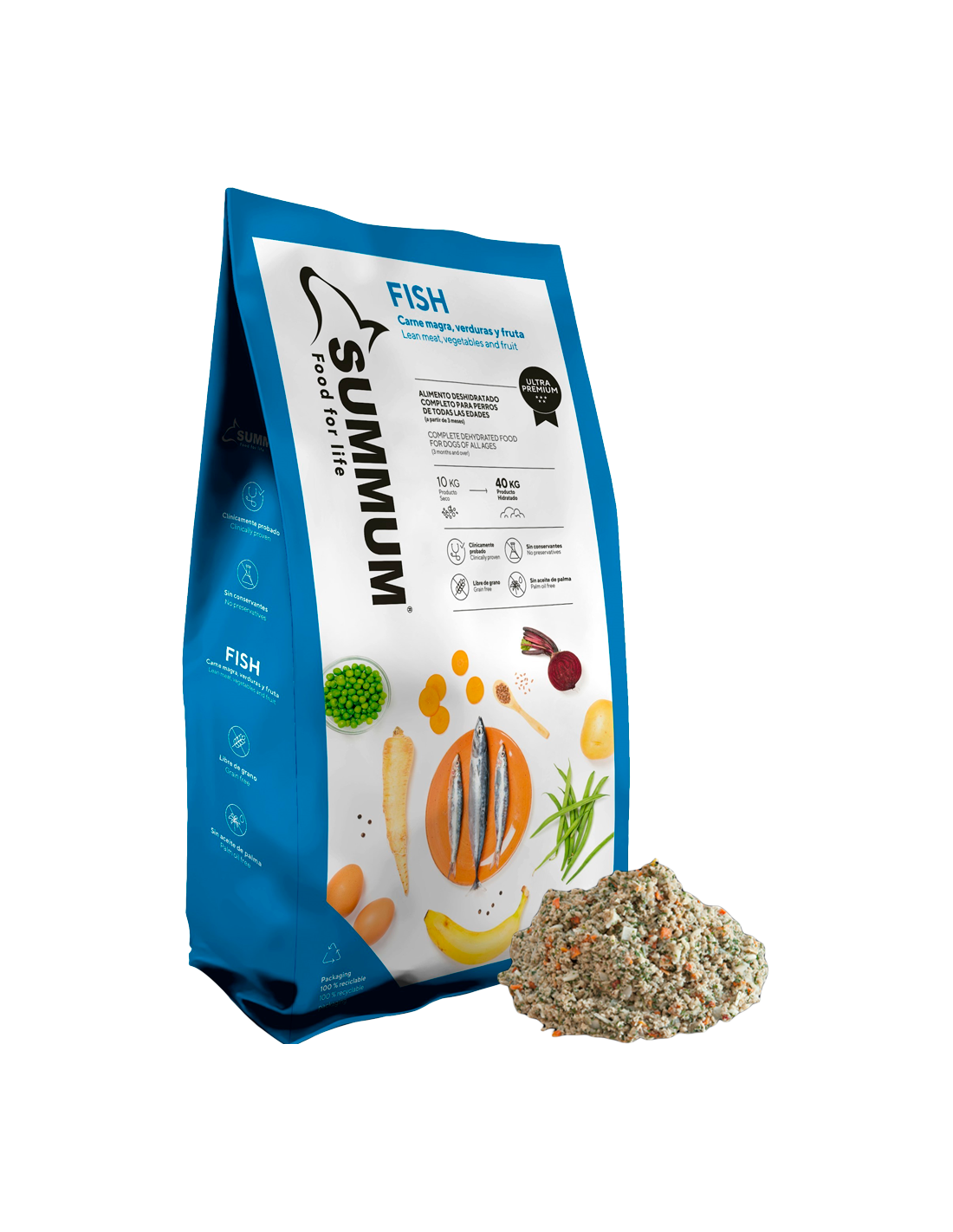 Summum Fish és un aliment deshidratat complet per a gossos de totes les edats (a partir dels 3 mesos), fabricat amb matèries primeres d'alta qualitat. Lliure de gra, conservants i colorants, aquesta recepta amb peix, verdures i fruita deshidratada està formulada amb ingredients de baixa capacitat al·lergènica. Conté ou deshidratat (proteïnes d'alt valor biològic), pèsols i polpa de remolatxa com a prebiòtics per a la salut digestiva i llavors de lli (font d'omega 3 i 6) per a una pell i pèl sans.