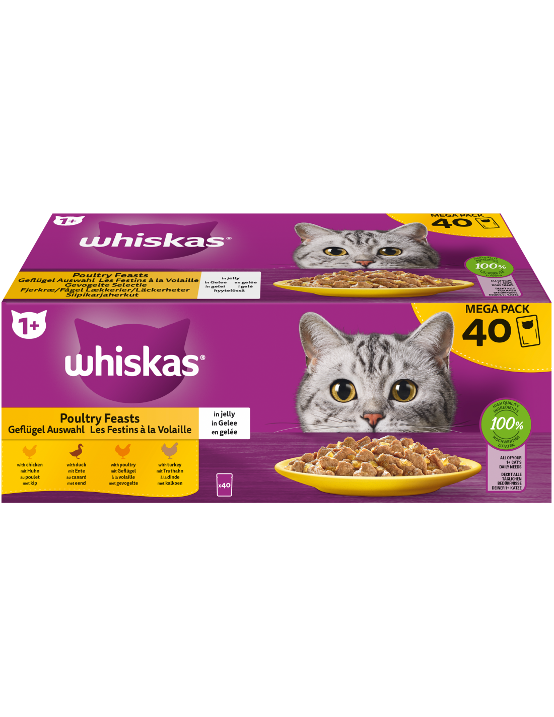 Receptes saboroses de menjar humit per a gats adults de totes les races. 4 varietats disponibles: pollastre, gall dindi, aus i ànec. Multipack de 40 sobres de 85 g.