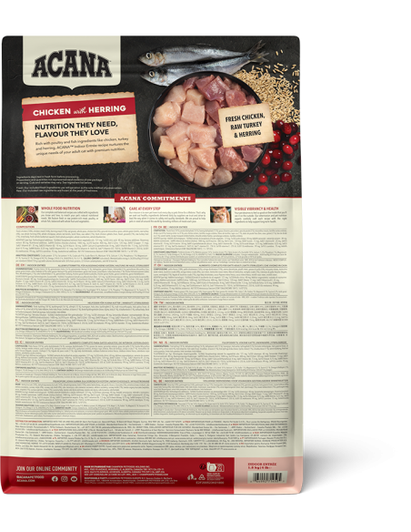 Carne de pollo fresca (16%), carne de pollo deshidratada (16%), arenque deshidratado (16%), avena entera, guisantes enteros, grasa de pollo (5%), hierba miscanthus molida, lentejas verdes enteras, carne de pavo fresca (4%), arenque entero crudo (4%), garbanzos enteros, lentejas rojas enteras, fibra de lenteja, conejo crudo entero (1%), menudillos de pollo frescos (hígado, corazón) (1%), menudillos de pavo frescos (hígado, corazón) (1%), cartílago de pollo (1%), algas secas, calabaza fresca entera, calabaza butternut fresca entera, arándano rojo fresco entero, arándano azul fresco entero