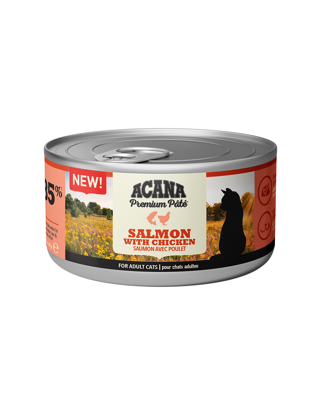 Nuestra receta de salmón con pollo es un paté rico en proteínas animales que está elaborado para satisfacer completamente a su felino. Sus ingredientes animales de primera calidad y el caldo de huesos proporcionan la nutrición de calidad que su gato necesita para vivir plenamente.Con un 85% de ingredientes animales de calidad, sin cereales y con un sabor naturalmente apetecible.