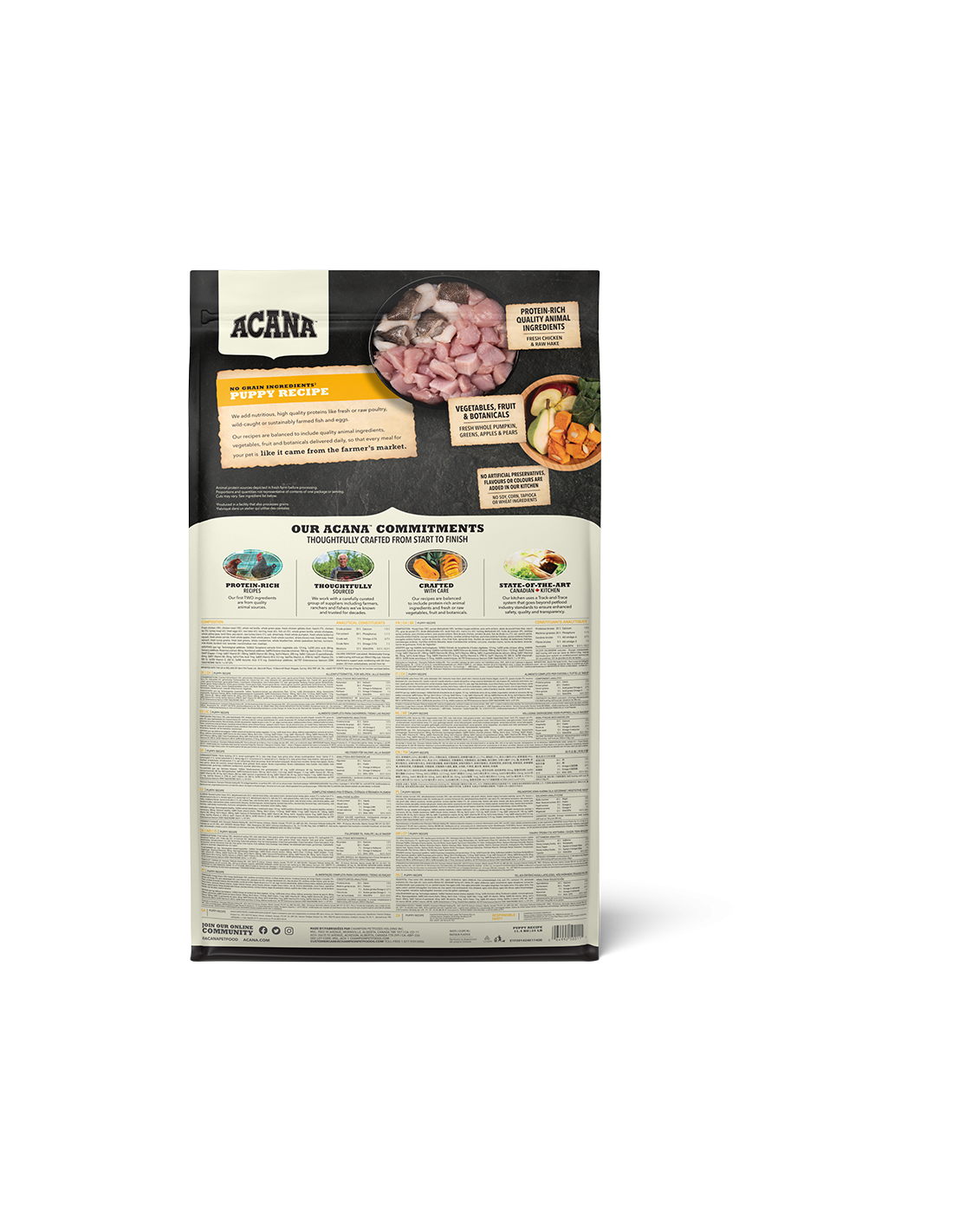 Carne de pollo fresca (16%), pollo deshidratado (13%), pavo deshidratado (13%), lentejas rojas, guisantes verdes enteros, menudillos de pollo frescos (hígado, corazón, riñón) (6%), grasa de pollo (6%), huevos enteros frescos (4%), platija entera fresca (4%), arenque deshidratado (3%), aceite de arenque (3%), alfalfa curada al sol (2%), lentejas verdes, judías verdes (2%), guisantes amarillos enteros, fibra de guisante, cartílago de pollo fresco (2%), algas marrones desecadas, calabaza entera fresca, calabaza butternut entera fresca, chirivías enteras frescas, col rizada fresca, espinacas frescas, hojas de mostaza frescas, hojas de nabo frescas, zanahorias enteras frescas, manzanas red delicious frescas, peras barlett frescas, hígado de pollo liofilizado, hígado de pavo liofilizado, arándanos rojos enteros frescos, arándanos azules enteros frescos, raíz de achicoria, cúrcuma, cardo lechoso, raíz de bardana, lavanda, raíz de malvavisco, escaramujos
