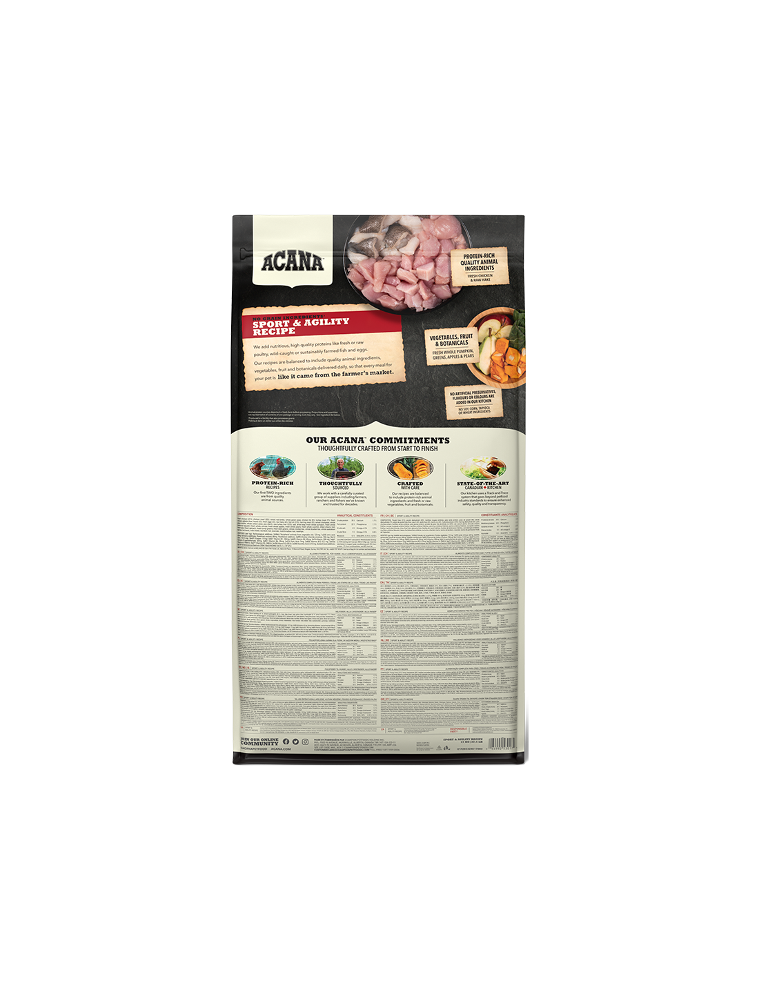 Alimento completo para perros adultos muy activos - Los perros con mucha energía siempre están ocupados, ya sea corriendo en el parque, haciendo aglity, canicross o ¡pastoreando ovejas! Por ello, ACANA Sport & Agility contiene un 35% proteínas y grasas de origen animal, que proporcionan toda la energía y resistencia que los perros activos necesitan.