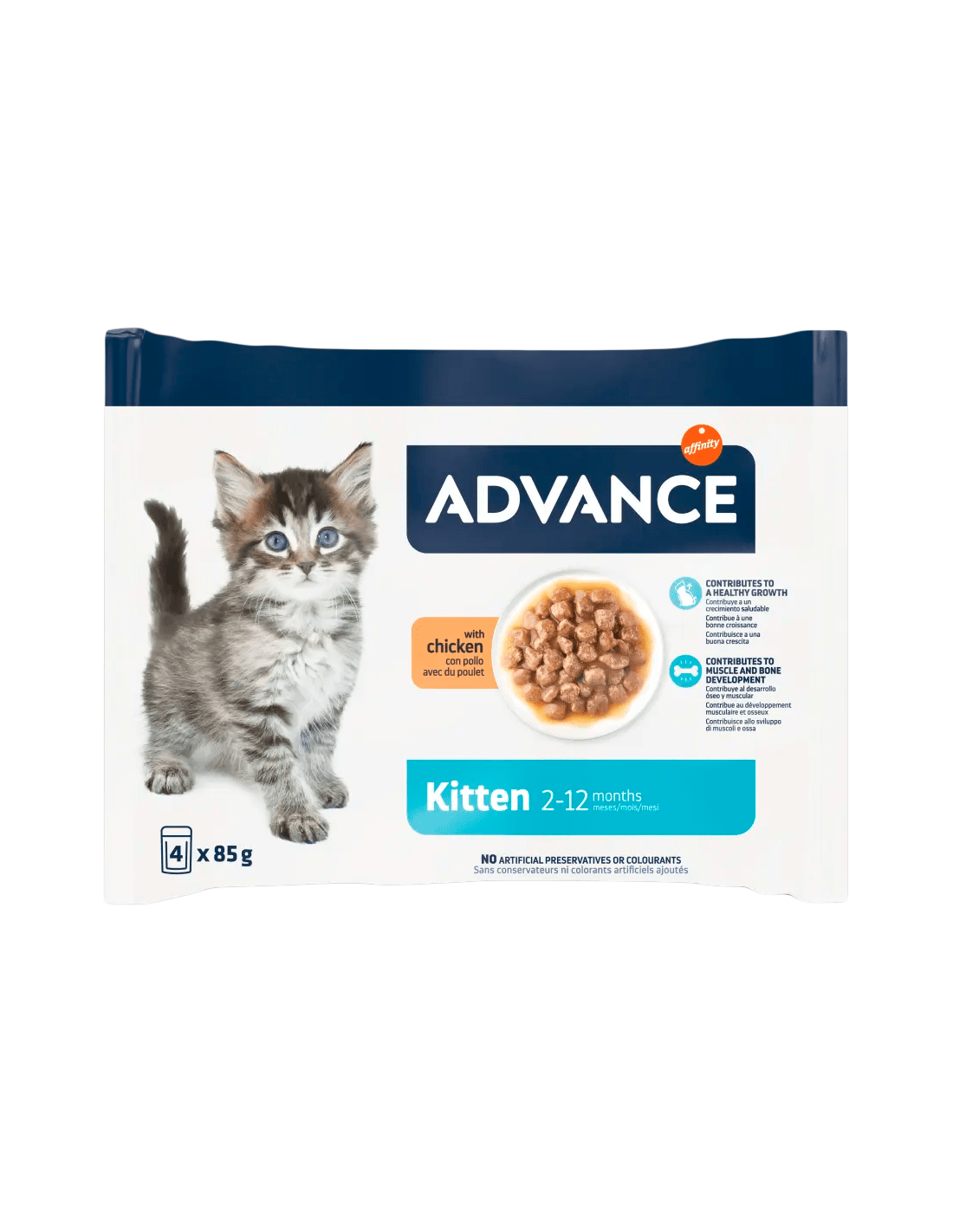 Advance Kitten con pollo es una comida húmeda equilibrada especialmente desarrollada para gatitos de hasta un año. Contiene una mezcla de nutrientes adaptados a las necesidades de los gatitos en crecimiento para favorecer un desarrollo óptimo, con ingredientes de alta calidad cocidos suavemente al vapor.