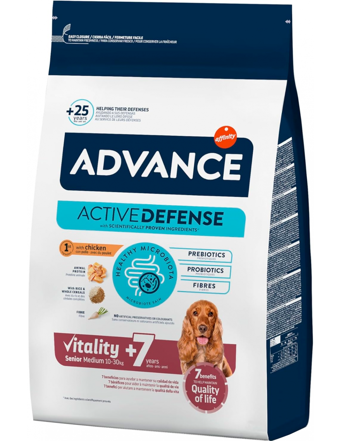 Advance Medium Senior es un pienso de calidad superior diseñado para perros medianos (10-30 kg) a partir de los 7 años. Su formulación se adapta a las necesidades específicas de esta fase de la vida, ofreciendo un aporte proteico ajustado, ingredientes de fácil digestión y apoyo integral para el bienestar.