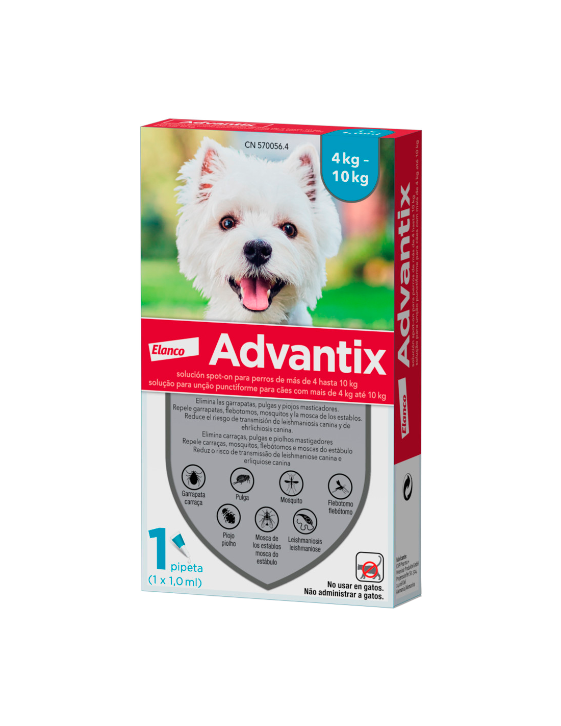 Las Pipetas Advantix para perros de 4-10 kg son un antiparasitario externo formulado con imidacloprid y permetrina. Ofrecen una amplia cobertura contra 6 parásitos: pulgas, garrapatas, flebótomos, mosquitos, piojos y moscas de los establos. Es la pipeta experta en leishmaniosis, reduciendo el riesgo de esta enfermedad y manteniendo su eficacia incluso si el perro se moja.
