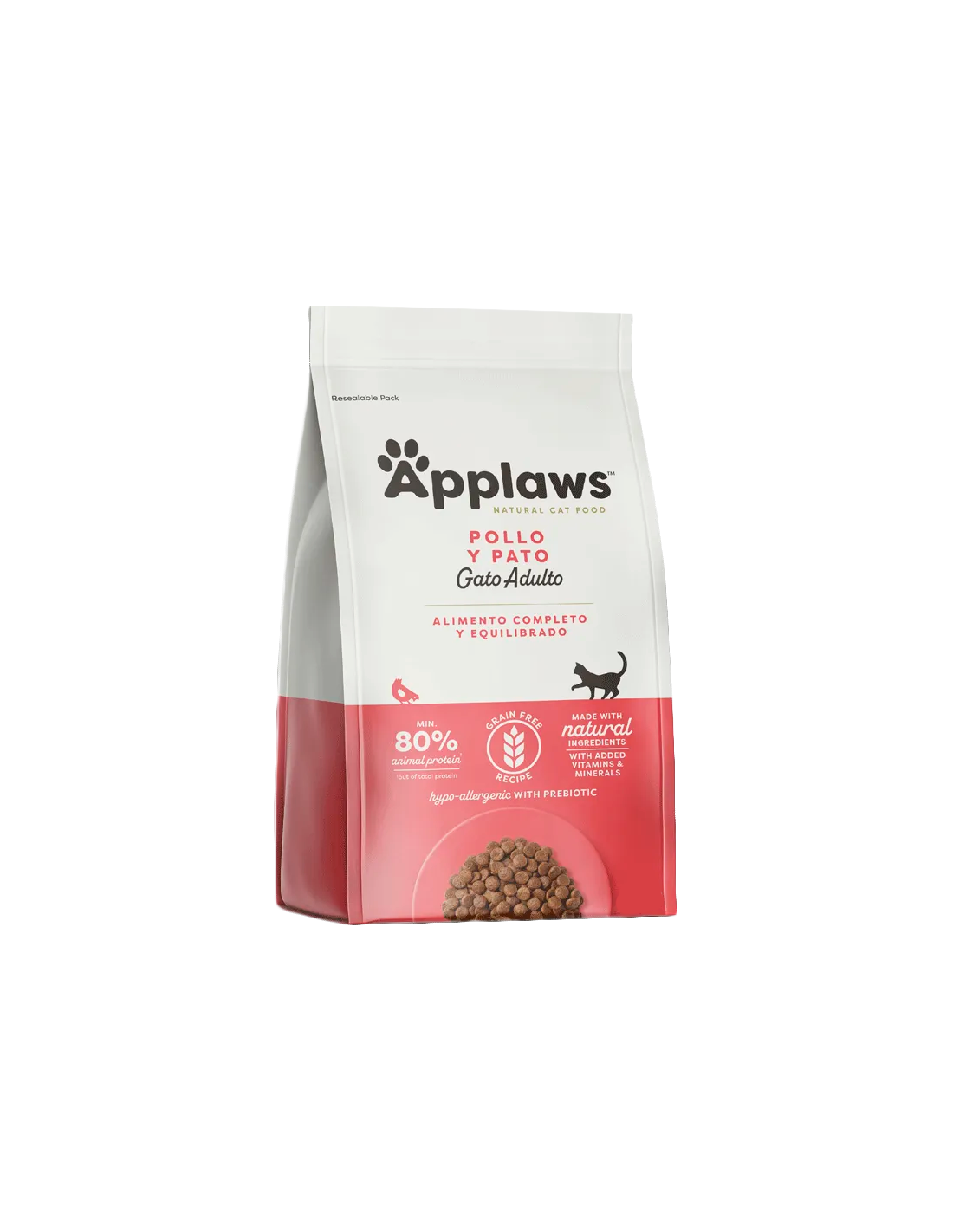 Applaws Cat Adult Pollo y Pato es un pienso natural y completo para gatos adultos, elaborado sin cereales ni aditivos artificiales. Contiene un alto porcentaje de pollo (47% seco, 16% fresco) y pato (21% seco) como fuentes de proteína, y es rico en taurina, un aminoácido esencial para la salud cardíaca y visual.