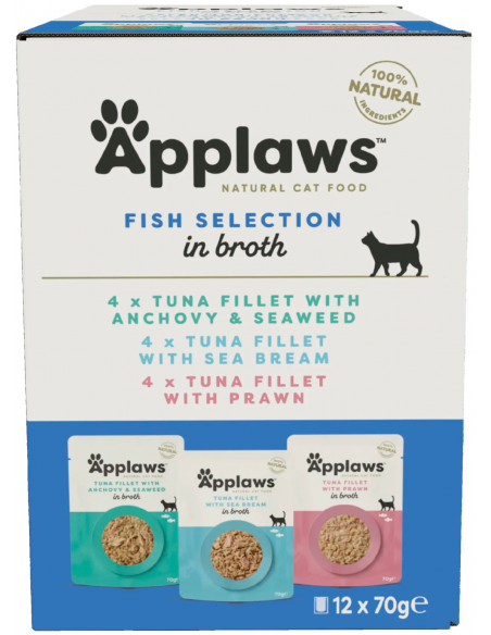 Applaws Adult Selección de Pescado en Caldo es un multipack de alimentación húmeda para gatos adultos con una variedad de recetas de pescado. Elaborado con ingredientes naturales, aporta una fuente natural de taurina esencial para el correcto funcionamiento del corazón y la salud ocular de tu gato. Para una dieta equilibrada, se recomienda combinarlo con un alimento completo Applaws (húmedo o seco).