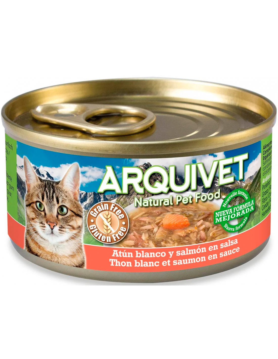 Arquivet Cat Atún Blanco y Salmón en Salsa son latas de jugosos filetes de atún blanco y salmón en salsa. Este sabroso y nutritivo alimento complementario, formulado con ingredientes naturales de gran calidad, aporta el líquido necesario para el buen funcionamiento renal de los gatos, siendo además sin cereales y sin gluten.