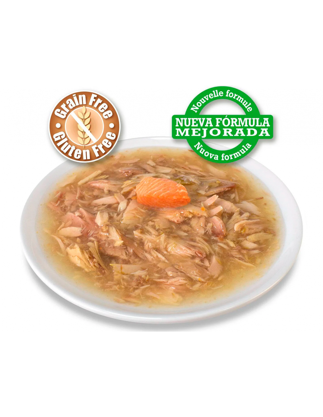 Comida húmeda complementaria de atún blanco y salmón en salsa para gatos. Sin cereales ni gluten. Lata de 80gr.