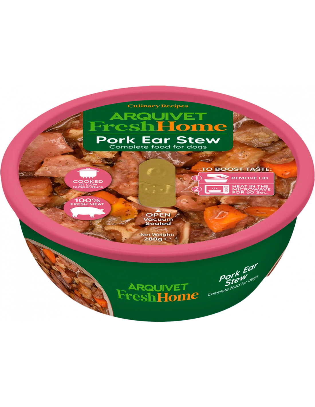 Arquivet FreshHome Estofado de Oreja de Cerdo es un alimento húmedo completo para perros, con una receta casera 100% natural, equilibrada y cocinada a fuego lento. Es ideal para perros de todas las edades, incluso aquellos con estómagos sensibles o alergias, y puede servirse como plato único o como delicioso "topping".